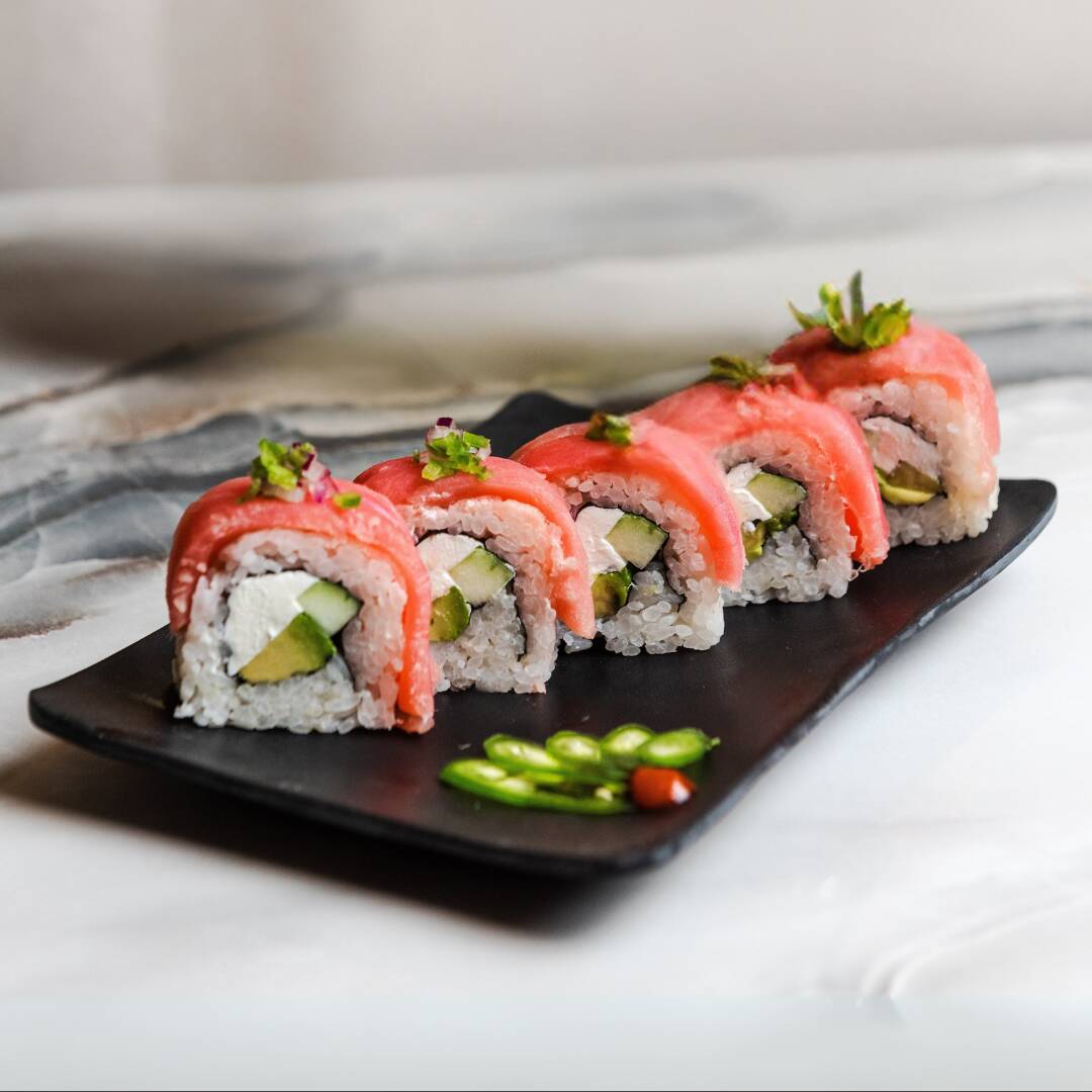 Por dentro: Philadelphia, pepino y aguacate. Por fuera: Atún, salsa de anguila y ajonjolí.