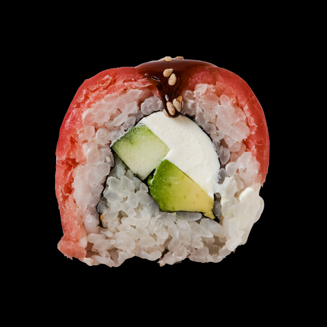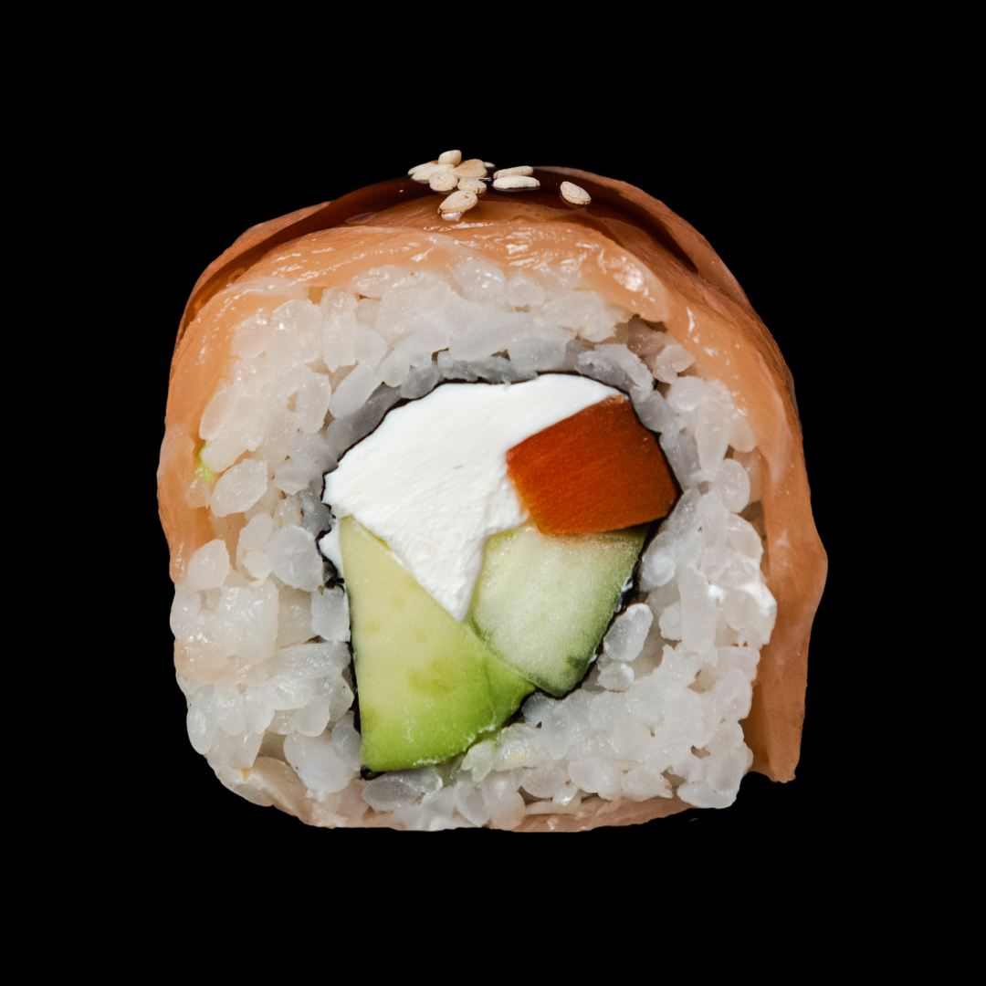 Por dentro: Philadelphia, aguacate, pepino y zanahoria. Por fuera: Salmón, salsa de anguila y ajonjolí blanco.