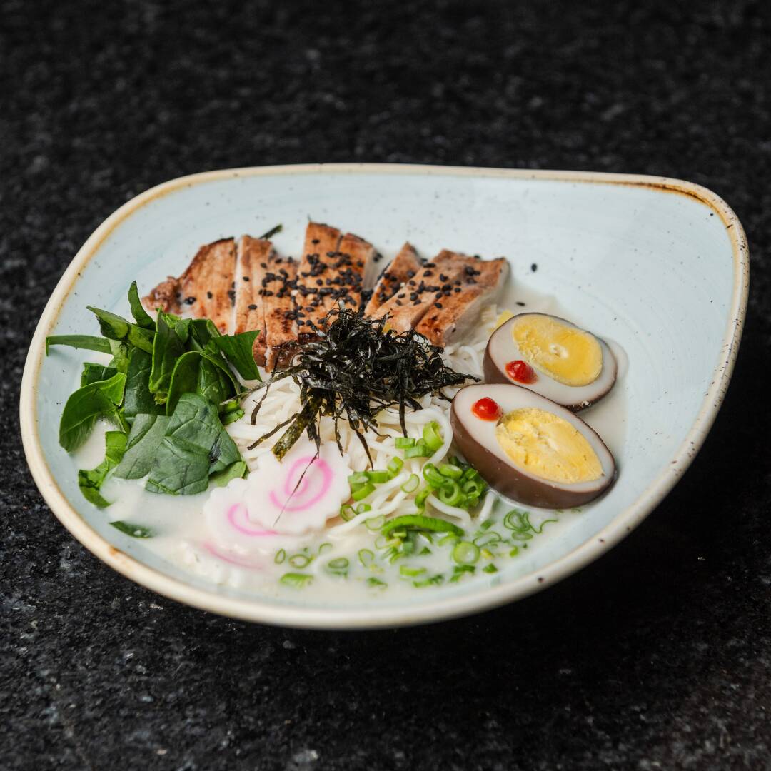 Fideos de arroz, fondo de poro y tocino, lomo marinado, huevo duro, cebollín, germen de soya, nori y naruto.