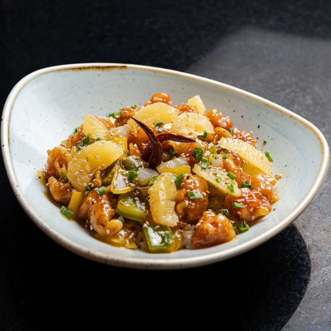 Pollo crocante con salsa de naranja, pimiento, cebolla y ajonjolí en cama de arroz gohan.