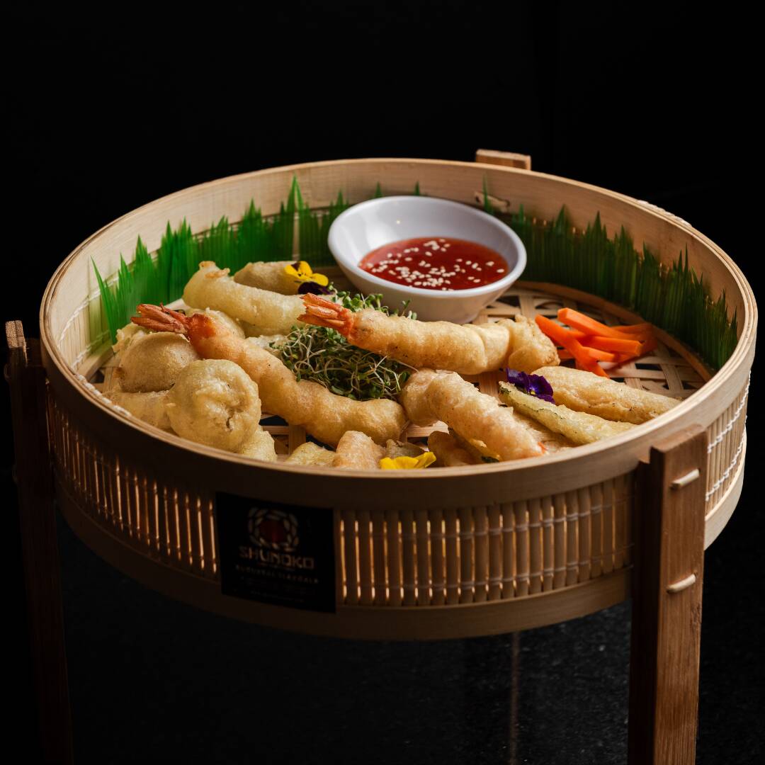 Shunoko flaming, mango roll, manchego roll, masago roll, kushiages de queso (ensalada kiuri kani GRATIS)