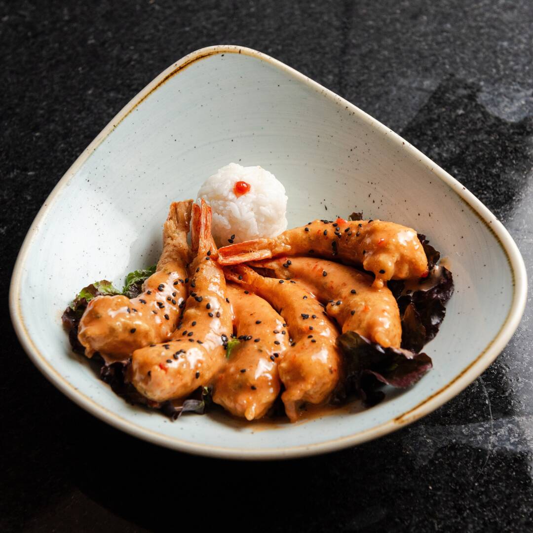 Camarones rebozados, aderezados con salsa de la casa, cebollín y ajonjolí.
