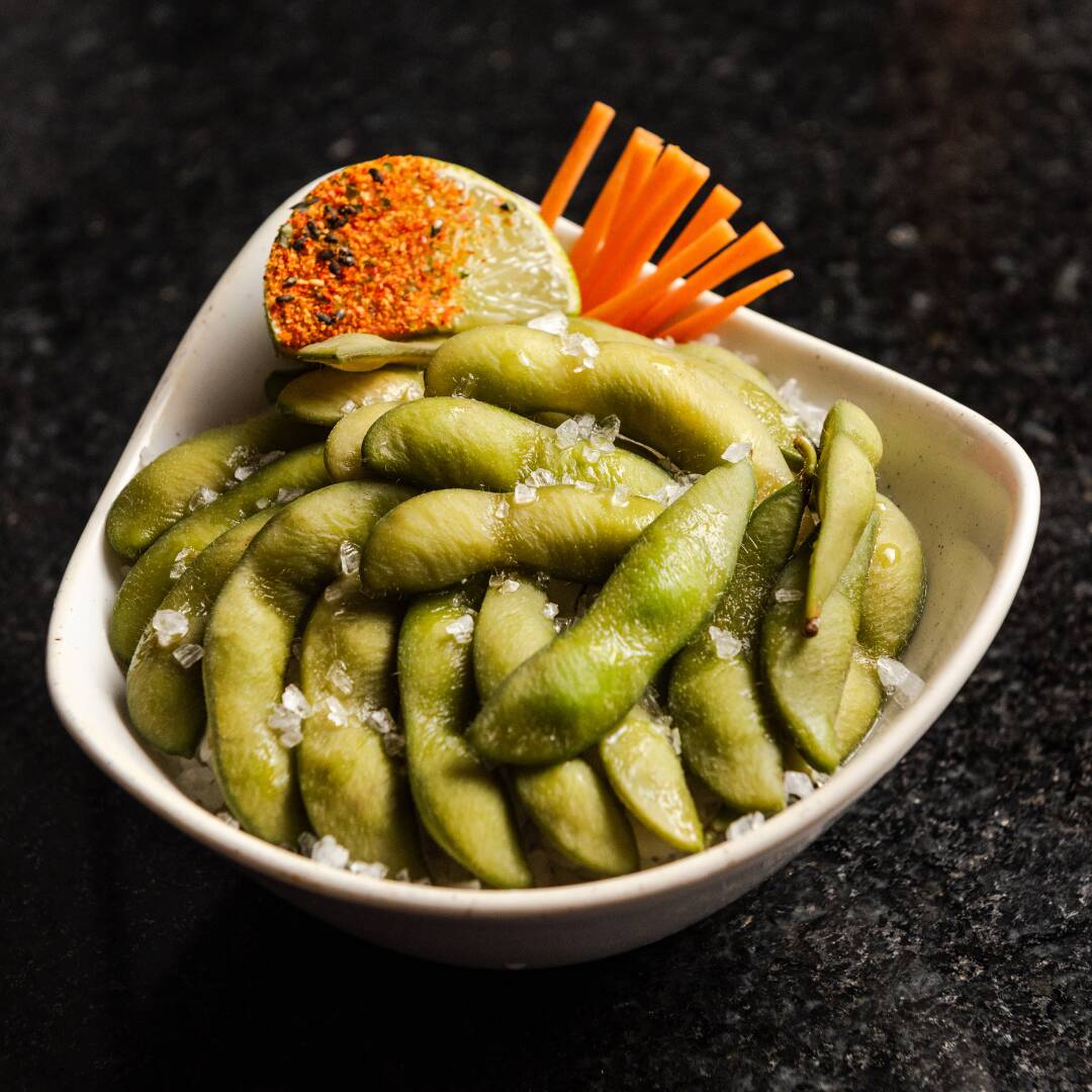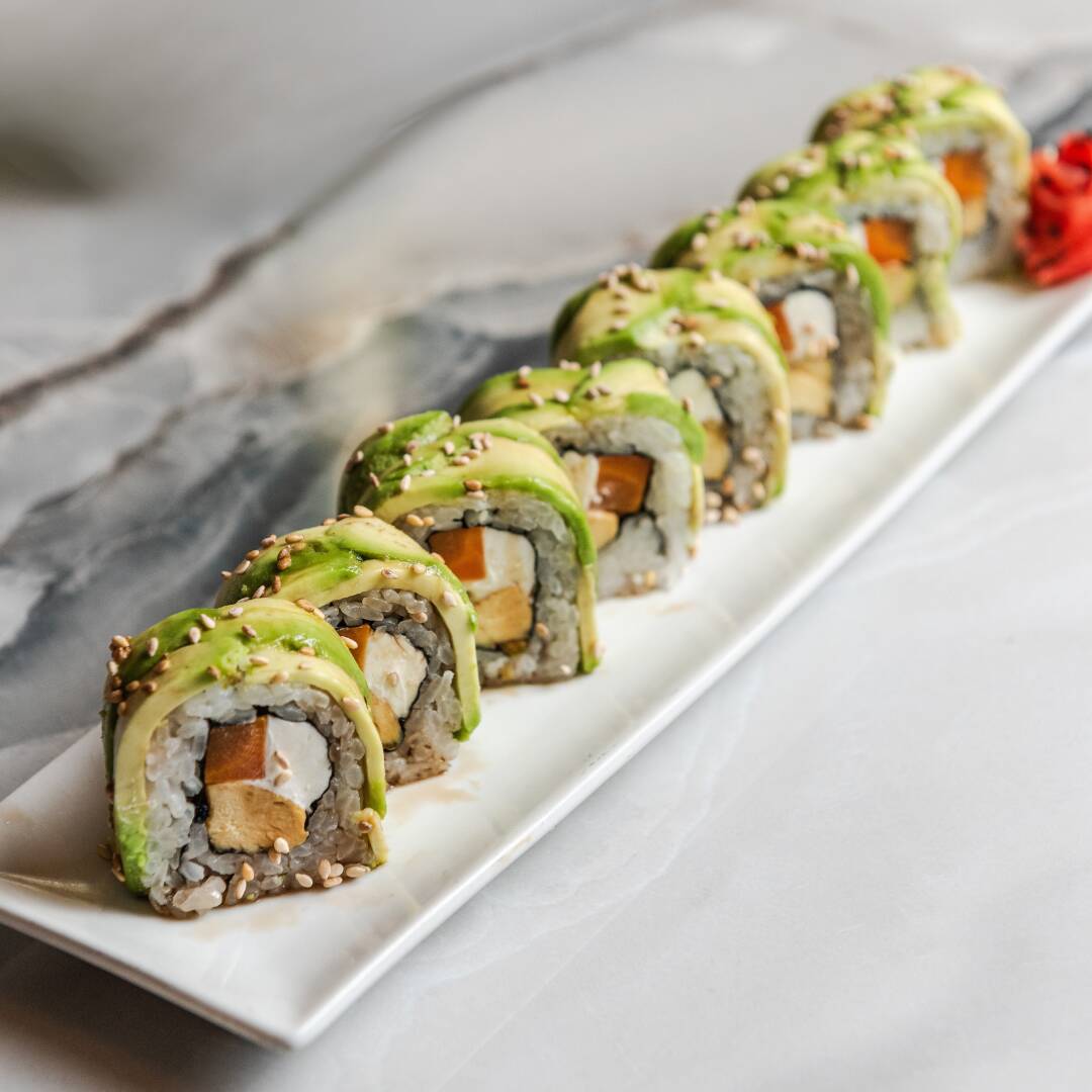 Por dentro: Philadelphia, zanahoria y pollo teriyaki. Por fuera: Capa de aguacate, ajonjolí y salsa de anguila.