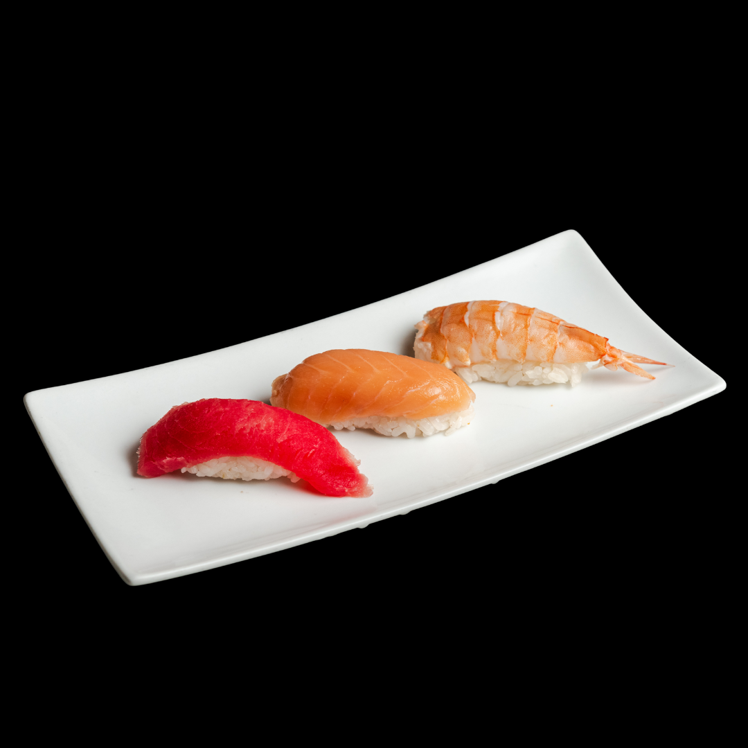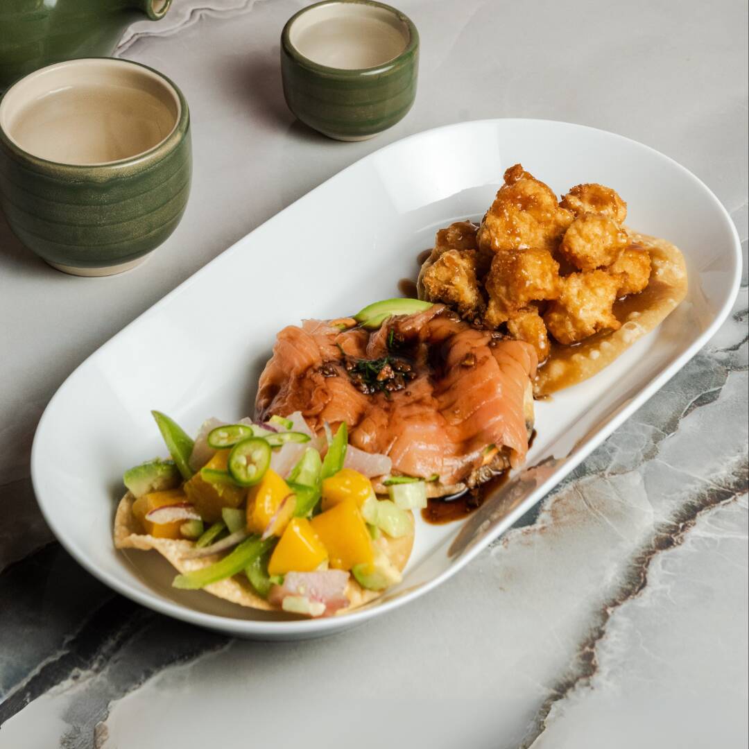 Ceviche robalo, ika fried, salmón garlic. (3 piezas)