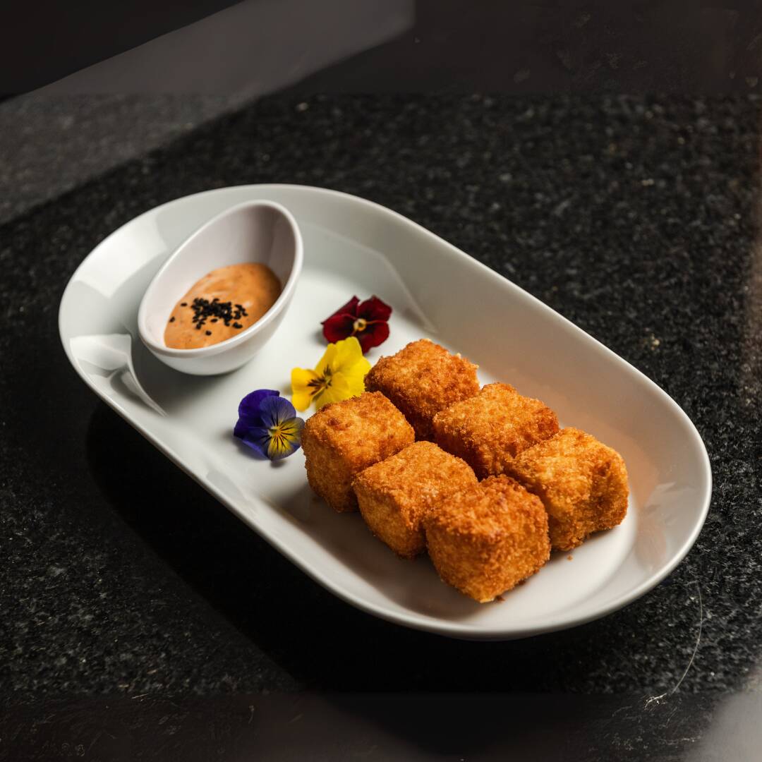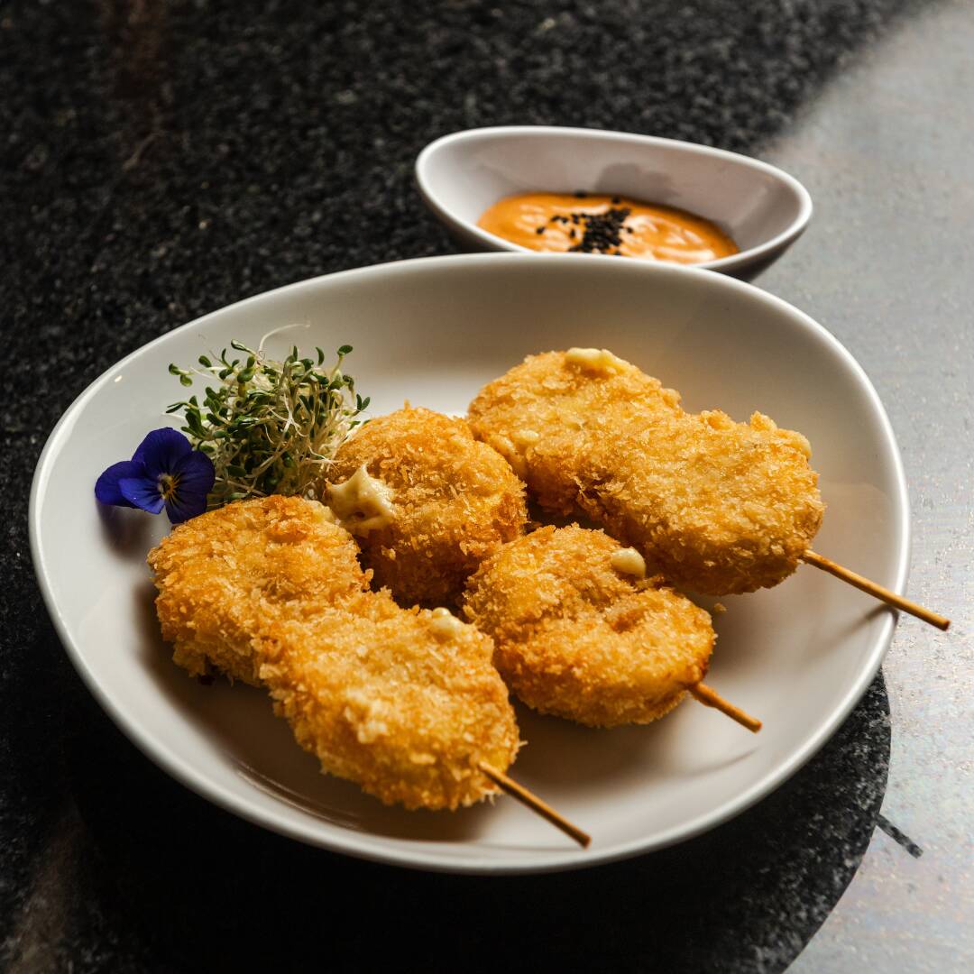 Kushiages de plátano con queso manchego. acompañados de aderezo de chipotle.