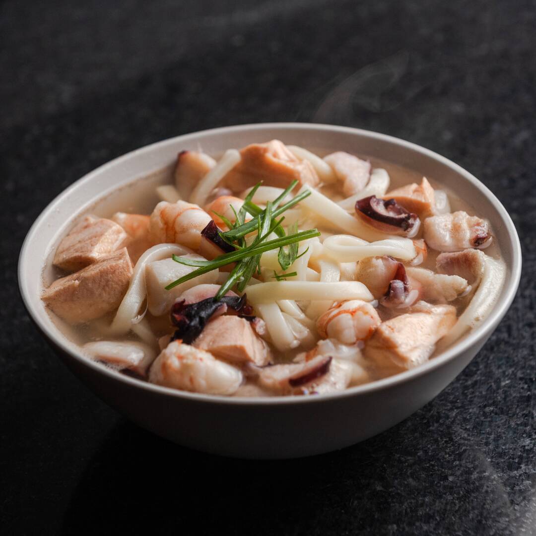 Fondo de pescado, udon, camarón, salmón, pulpo y robalo.