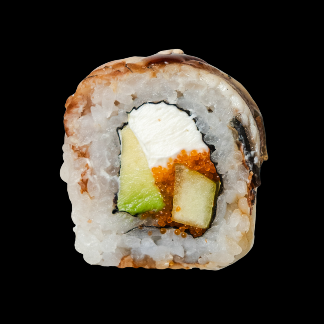 Por dentro: Pepino, aguacate, queso y masago. Por fuera: Anguila, bañado en salsa de anguila y espolvoreado con ajonjolí.