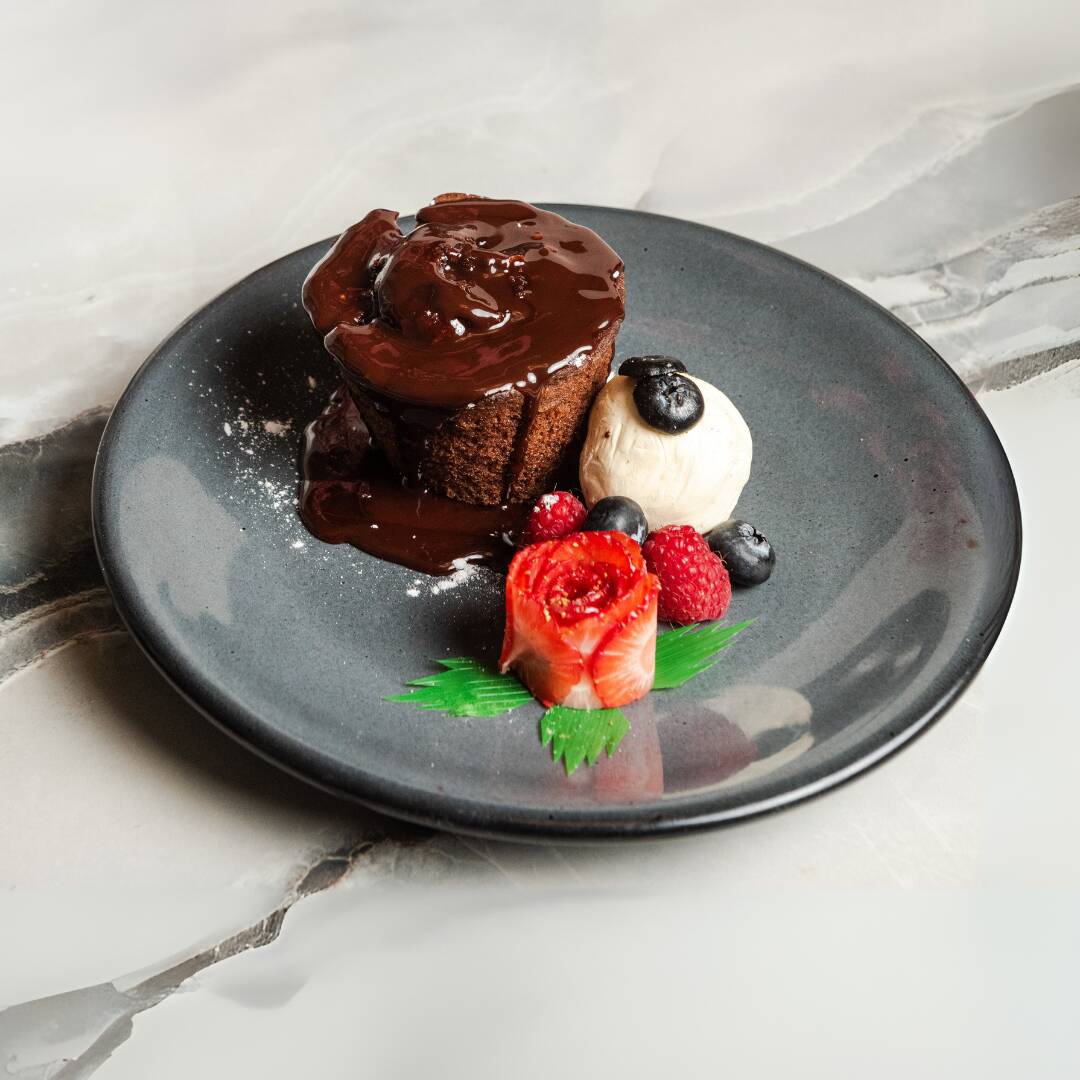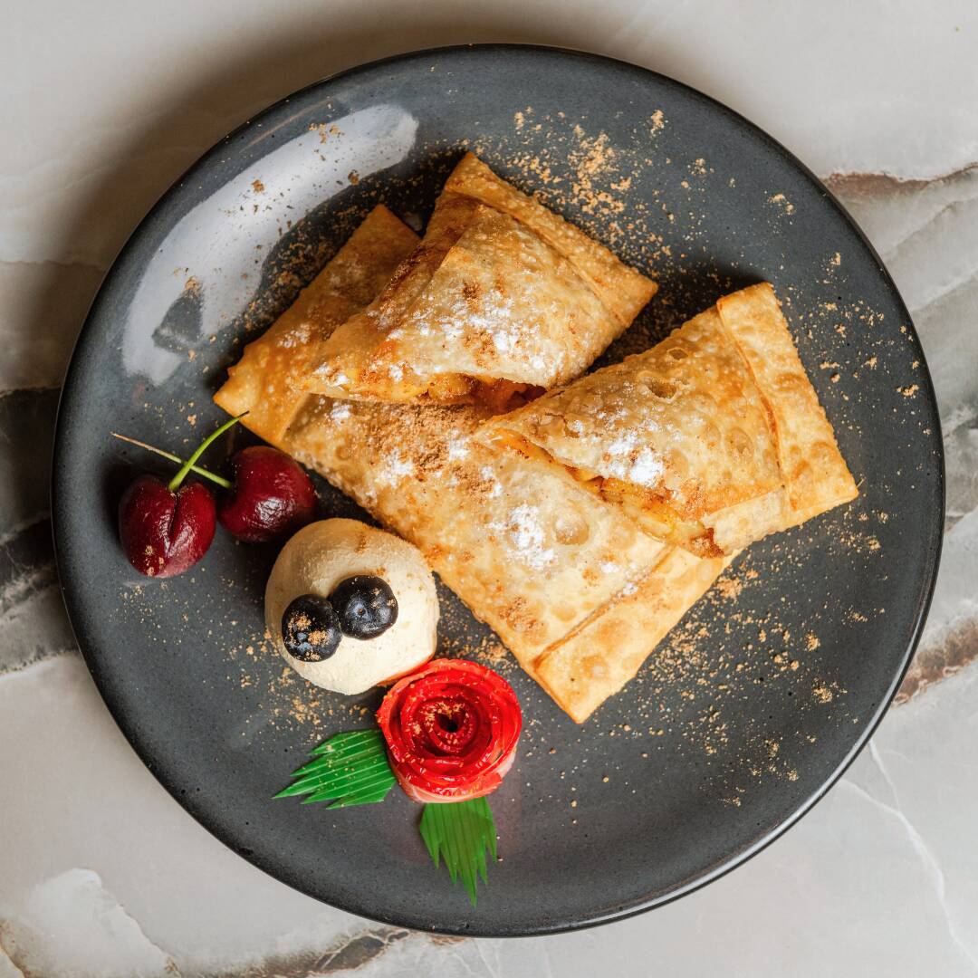 2 piezas de empanadas de manzana con helado y frutos rojos.