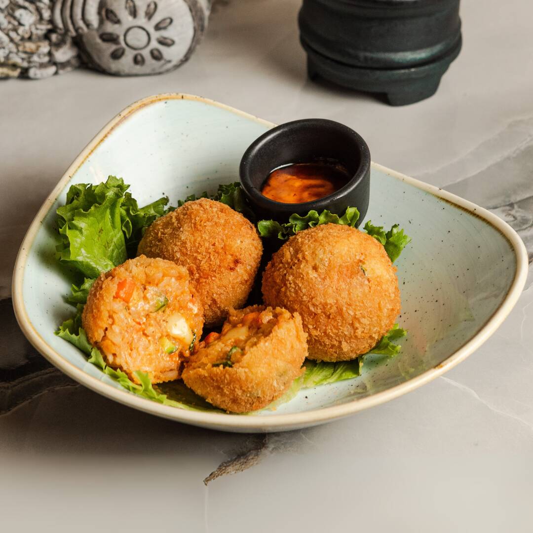 Esferas yakimeshi, camarón, manchego y aderezo de chipotle. (3 piezas)