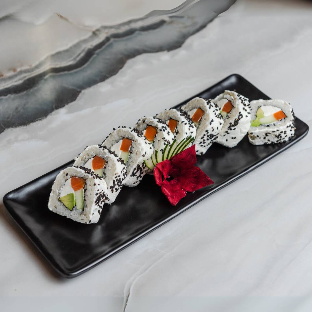 Por dentro: Philadelphia, aguacate, pepino y zanahoria. Por fuera: Philadelphia, ajonjolí negro y aderezo de chipotle.