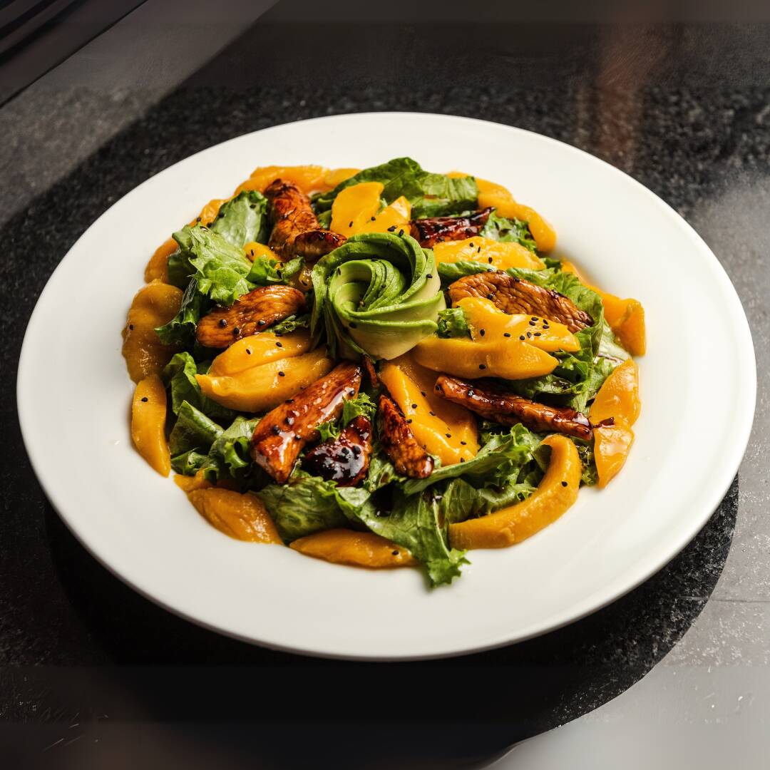 Lechuga sangría, mango, aguacate, pollo a la plancha, salsa de anguila y ajonjolí espolvoreado.