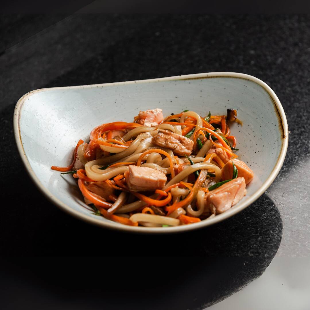 Pasta udon, verduras y salsa de anguila. (Pollo, pulpo, camarón o filete de salmón a tu elección)