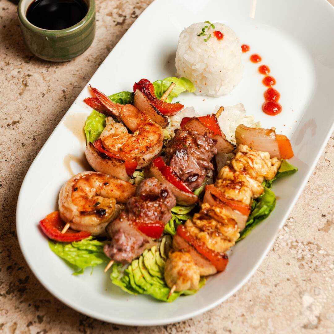 Brocheta de pollo, res, camarón, cebolla y pimiento morrón. Bañada en salsa de anguila
