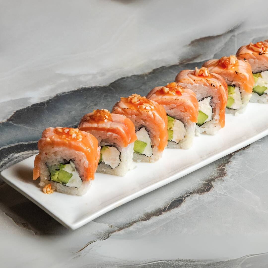 Por dentro: Aguacate, cebollín, masago y philadelphia. Por fuera: Salmón y aderezo de chipotle.