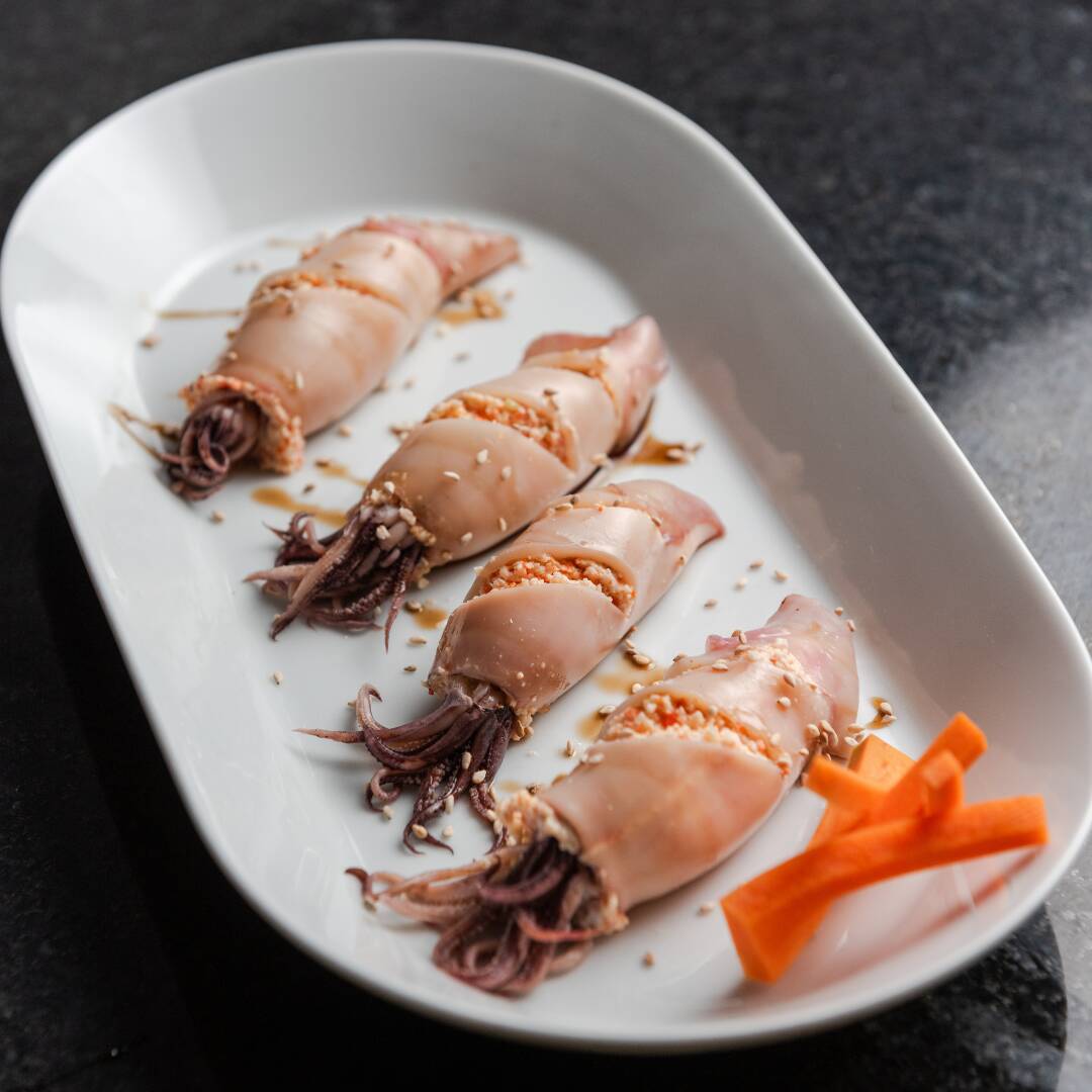 Calamares rellenos de pasta especial, acompañados de salsa de anguila y ajonjolí.