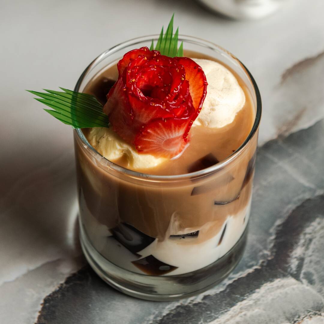 Gelatina de café, carnation, licor de café y helado de vainilla.