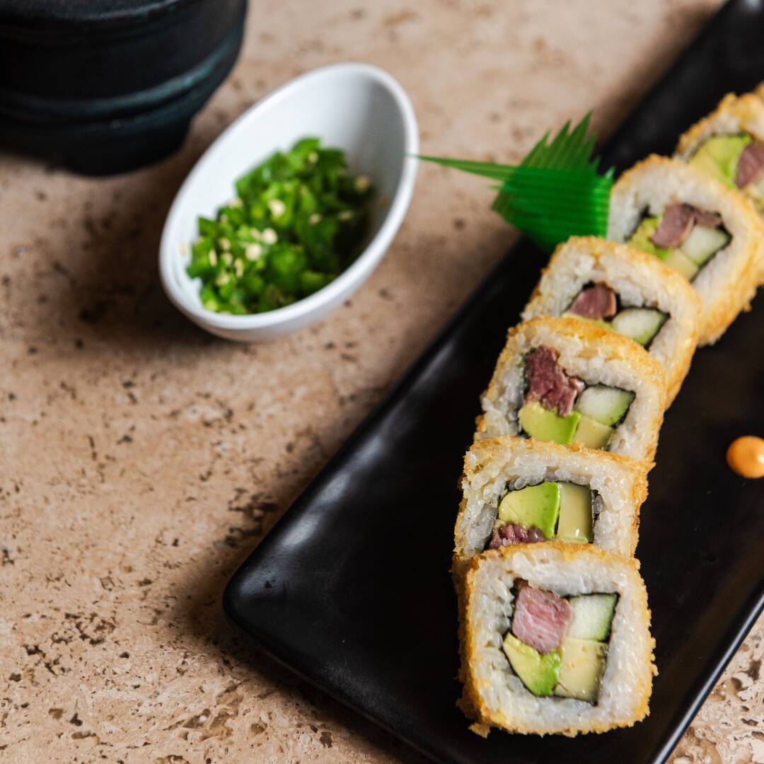 Por dentro: Kakiage, aguacate y camarón empanizado. Por fuera: Philadelphia garlic, con topping de láminas de serrano y gotas de sriracha.