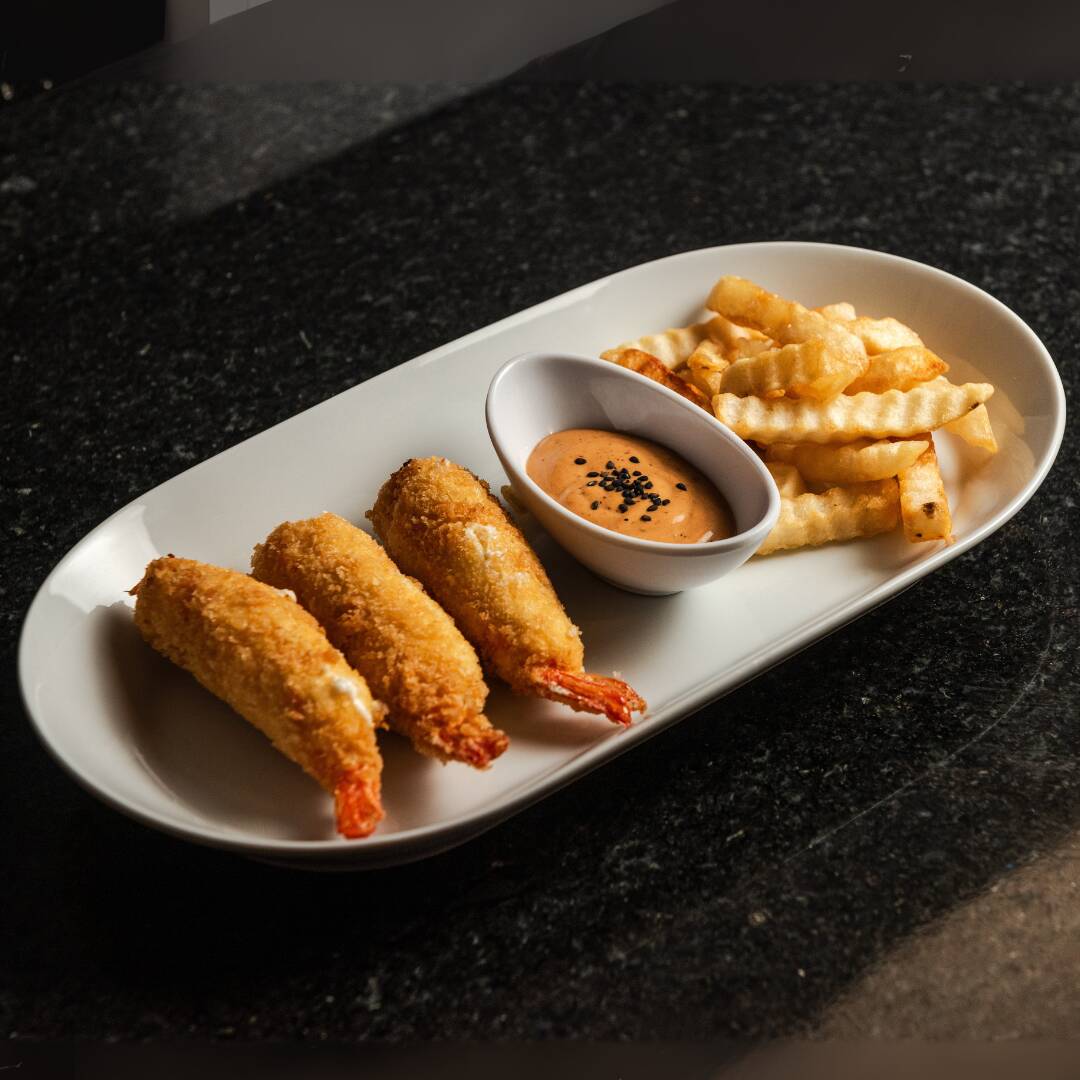 Ebi especial de camarón con queso philadelphia. acompañados con papas a la francesa y aderezo de chipotle.