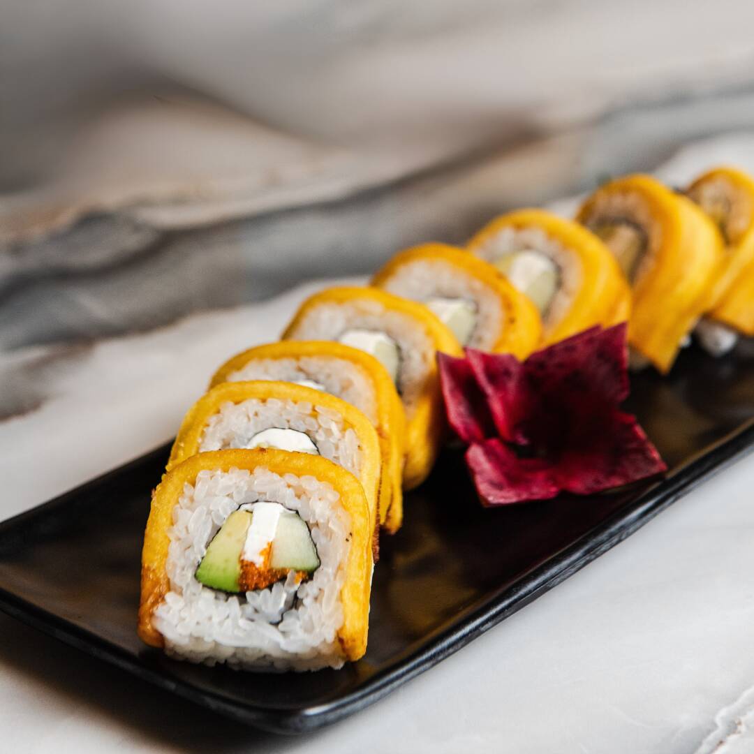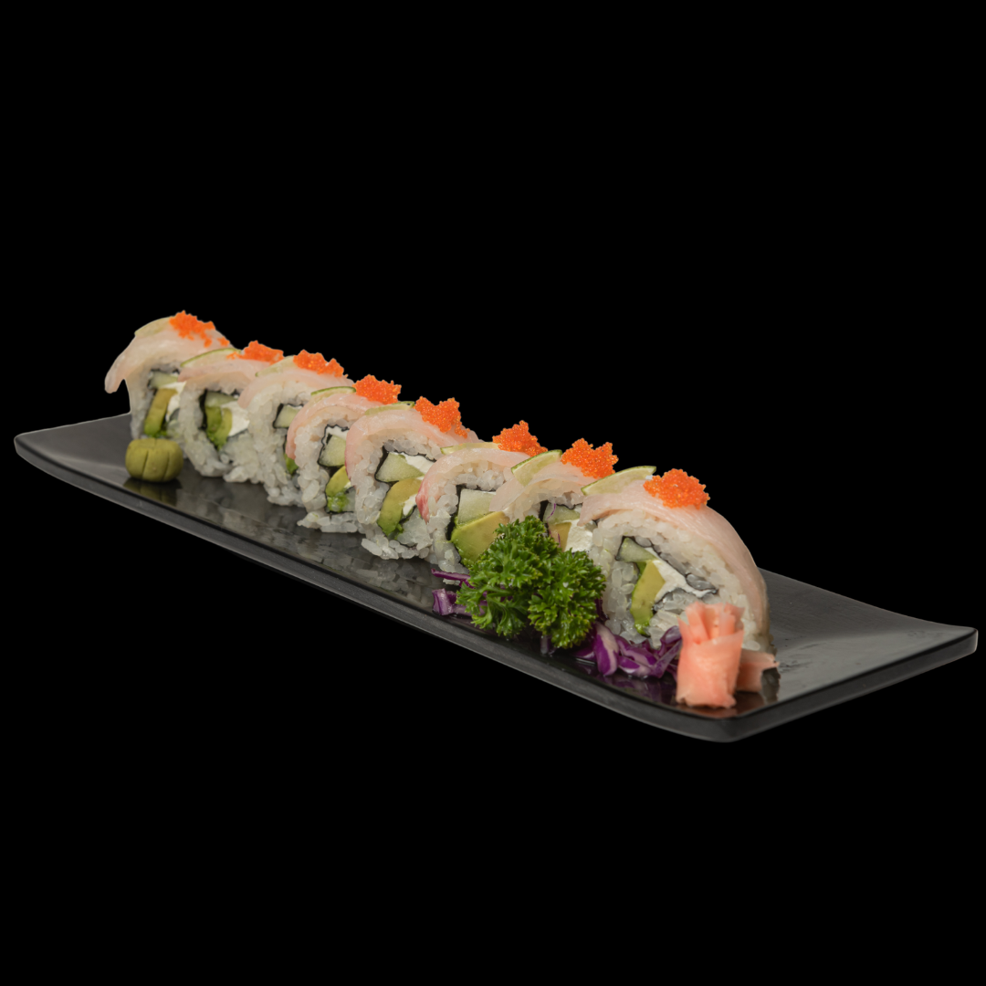 Por dentro: Pepino, aguacate y philadelphia. Por fuera: Láminas de robalo, salseado con salsa garlic, coronado con láminas de limón y masago.