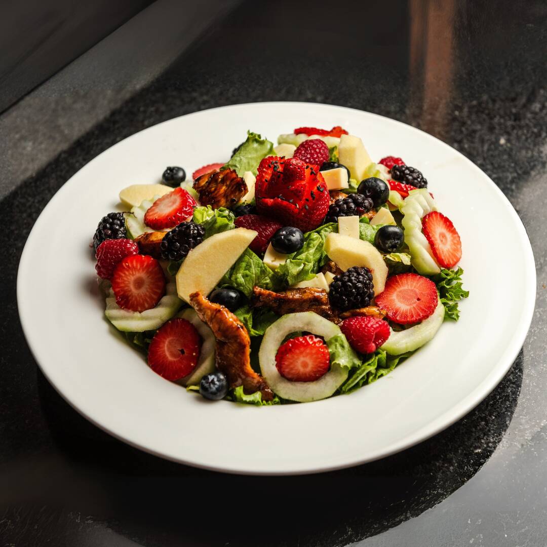 Lechuga sangría, manzana, pepino, zarzamora, fresa, arándanos, pollo a la plancha y cubitos de queso manchego acompañada de salsa de frutos rojos.