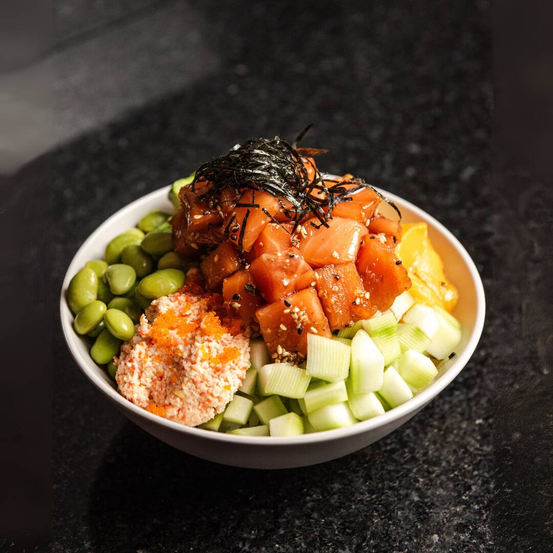 Arroz Gohan, salmón fresco, furikake, manzana o mango, aguacate, edamames al vapor, pasta baby, pepino, zanahoria y pelo de ángel.