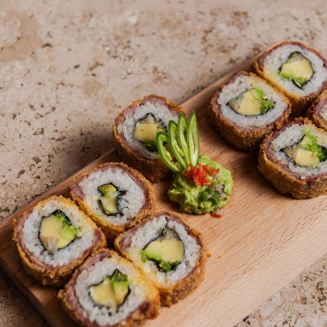 1 Rollo de sushi de 10 bocados por dentro: Philadelphia, aguacate y cangrejo empanizado. Por fuera: Capa de tampico y aderezo de chipotle.