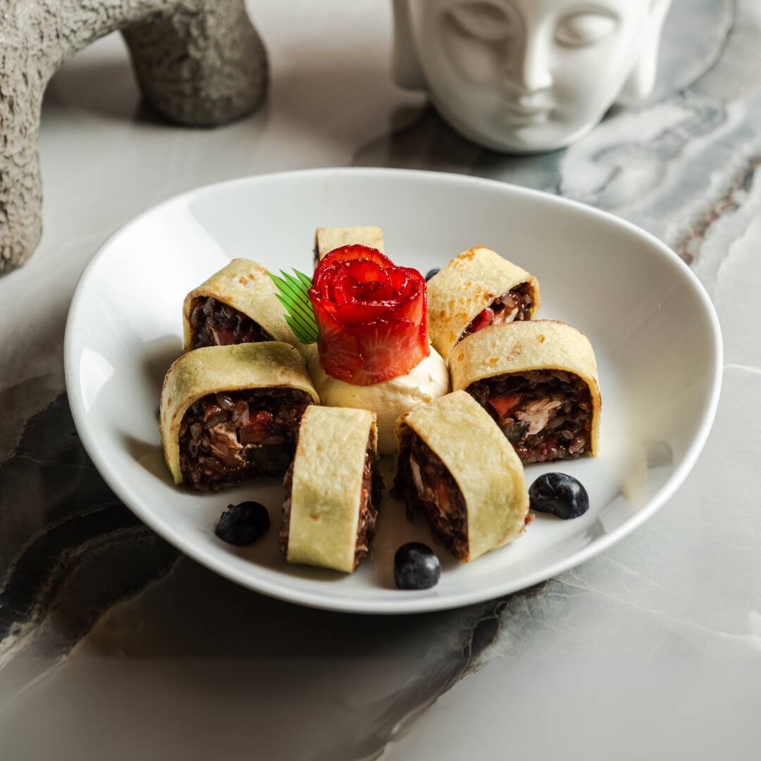 Rollo de arroz con Nutella, cubierto con una crepa y relleno de frutos rojos.