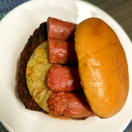 Pan brioche, carne sabor angus asada al carbón, mayonesa, ketchup, mostaza, jitomate, cebolla, queso de hebra, salchicha, piña