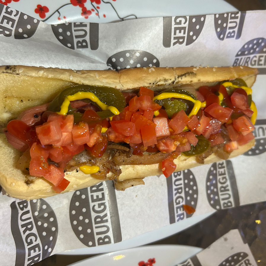 Pan brioche, carne sabor angus asada al carbón, mayonesa, ketchup, mostaza, jitomate, cebolla, queso de hebra, salchicha.