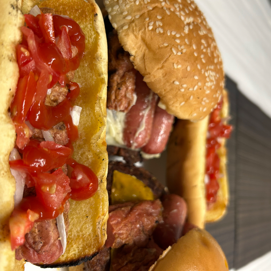 Pan brioche, doble porción de carne sabor angus asada al carbón, mayonesa, ketchup, mostaza, jitomate, cebolla, queso de hebra, salchicha.