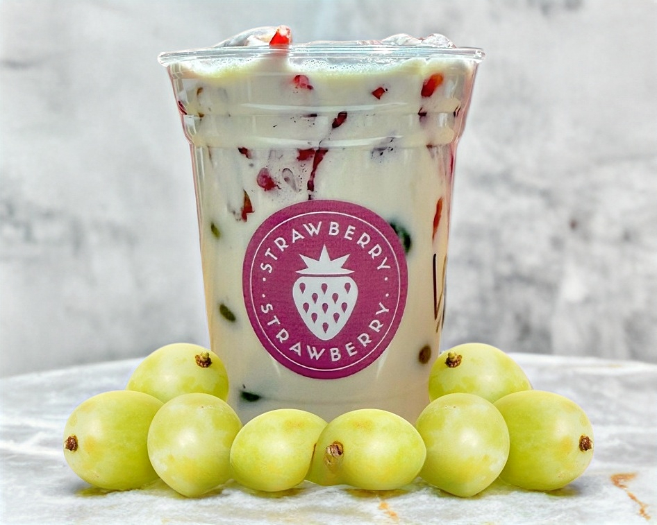 Vaso de fresas con uvas verdes y crema chico (354 mil) acompaña con 1 espiral y 1 topping de tu selección.