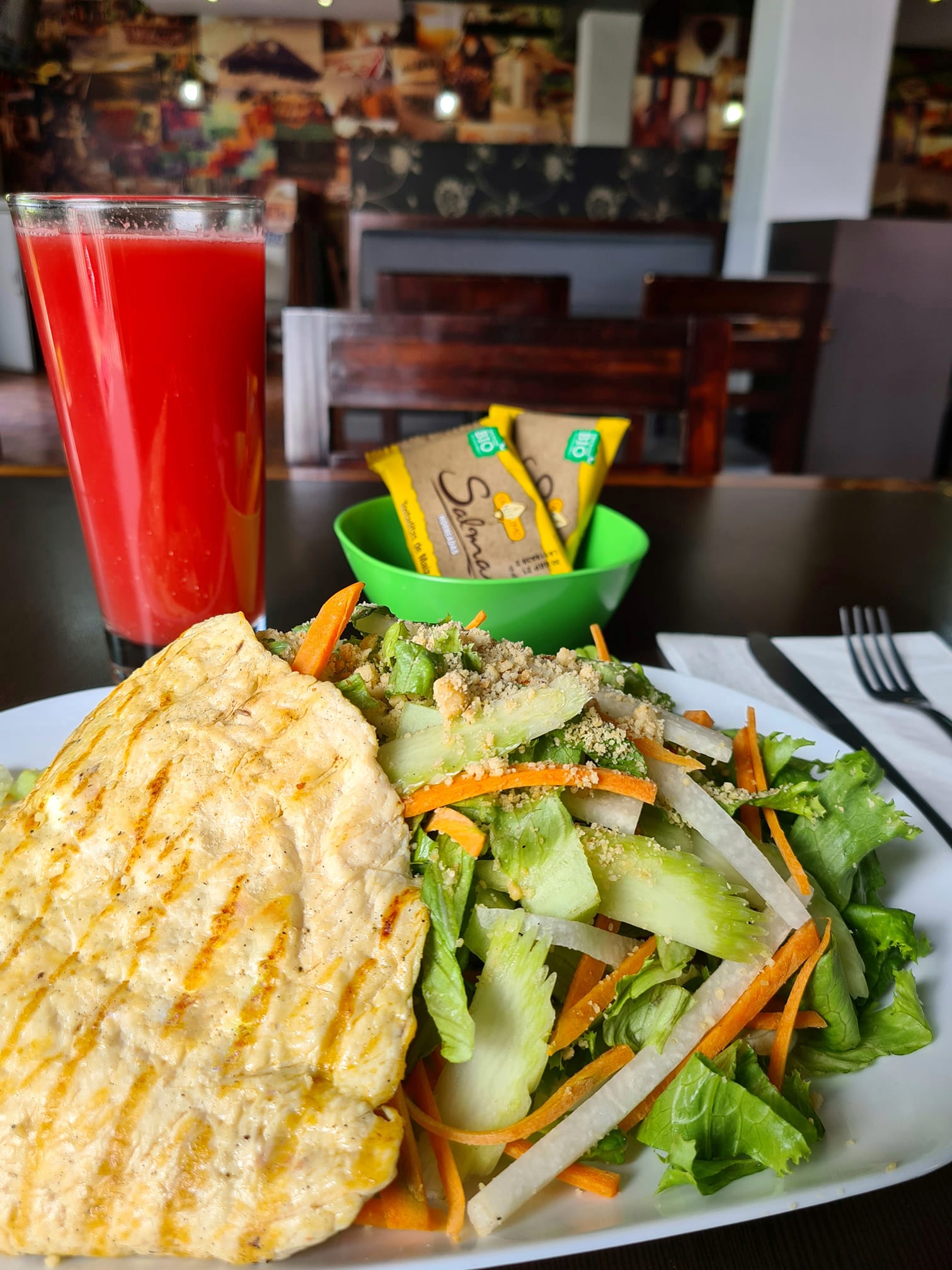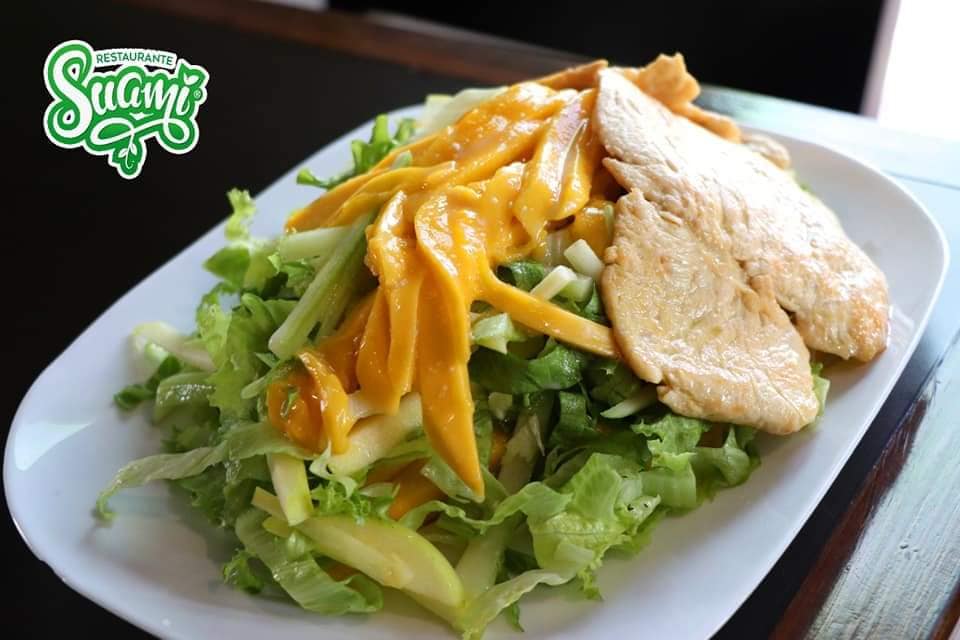 Lechuga, manzana, pepino y mango con aderezo de coco. Acompañada de atún o pollo a la plancha a elegir.