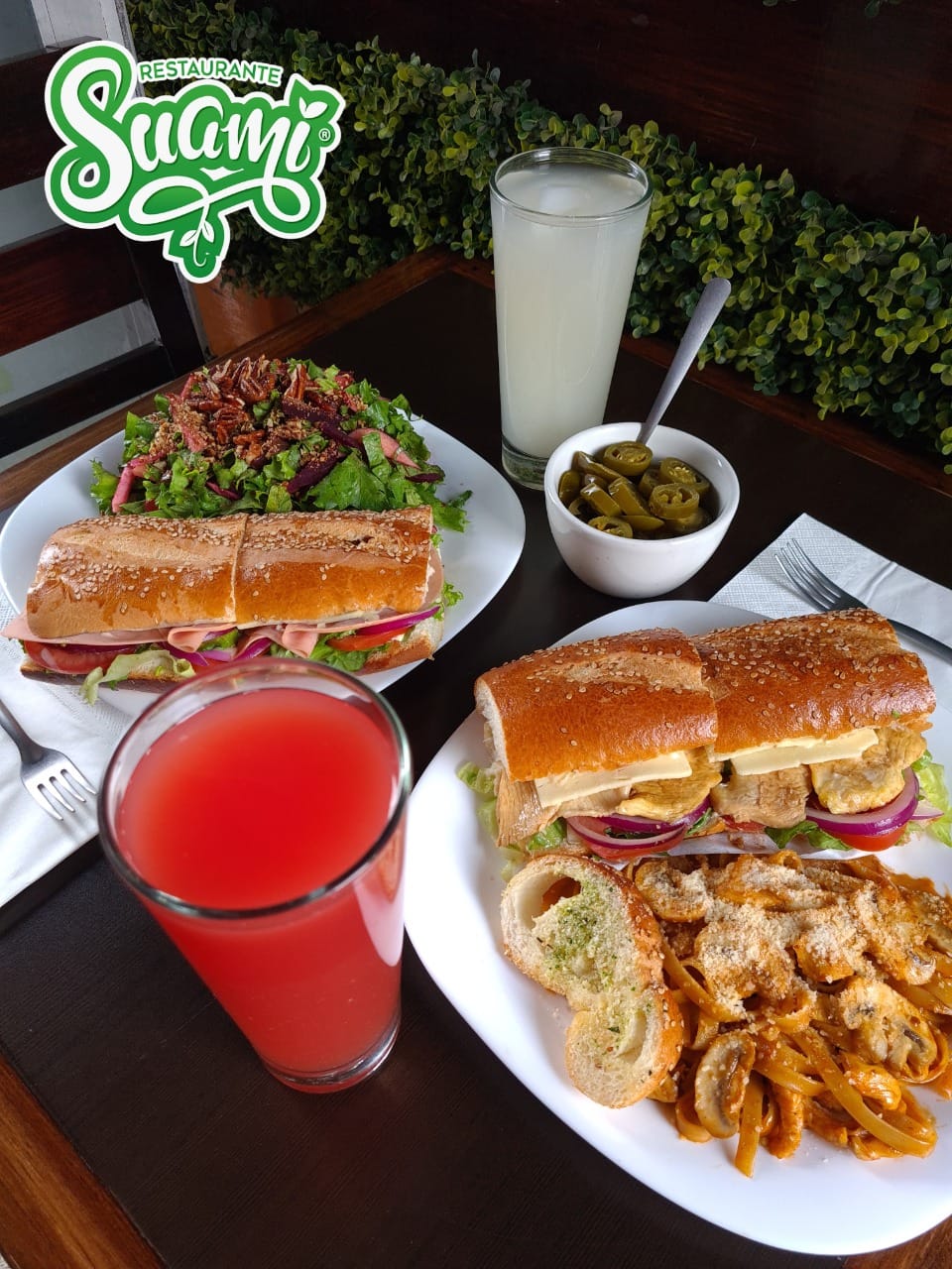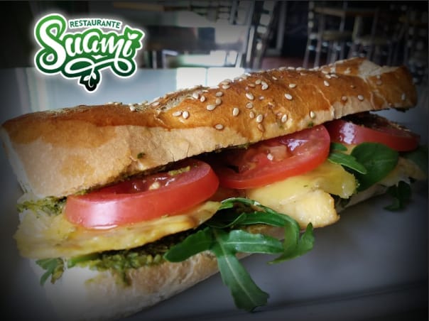 Baguette de 40 cms con mayonesa, lechuga, pepino, jitomate, cebolla, pimiento morrón, aguacate, germen de alfalfa, zanahoria, queso manchego y aderezo balsámico.
