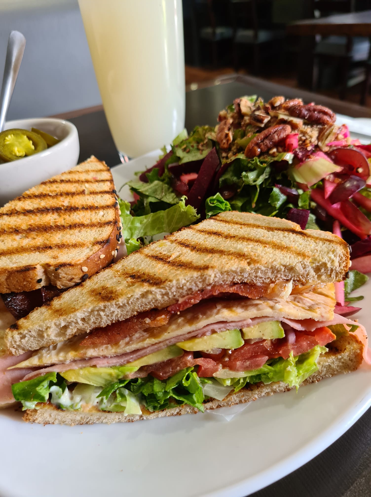 Lechuga, betabel, manzana, uva y nuez california con aderezo balsámico. Acompañada de atún o pollo a la plancha a elegir.