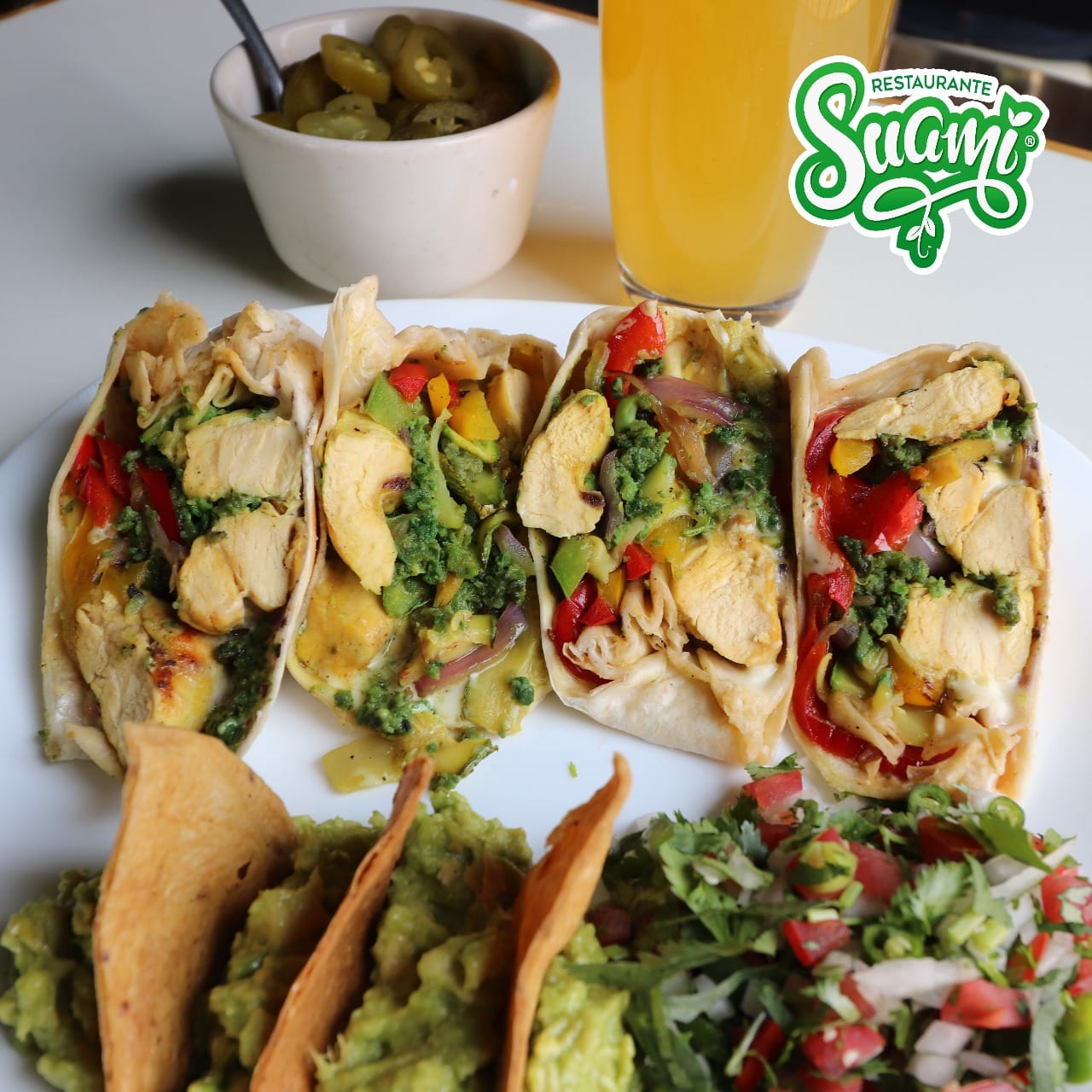 Cuatro tortillas rellenas de pollo o res o chorizo argentino, con crema, cebolla, chile serrano salteado y aguacate.