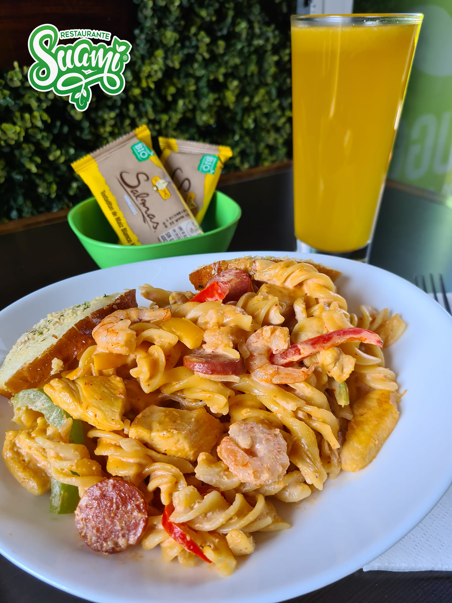 Pasta fusilli, pimiento morrón, jamón, queso panela en cuadritos, espárragos, arúgula y tomate cherry con aderezo Pesto.
