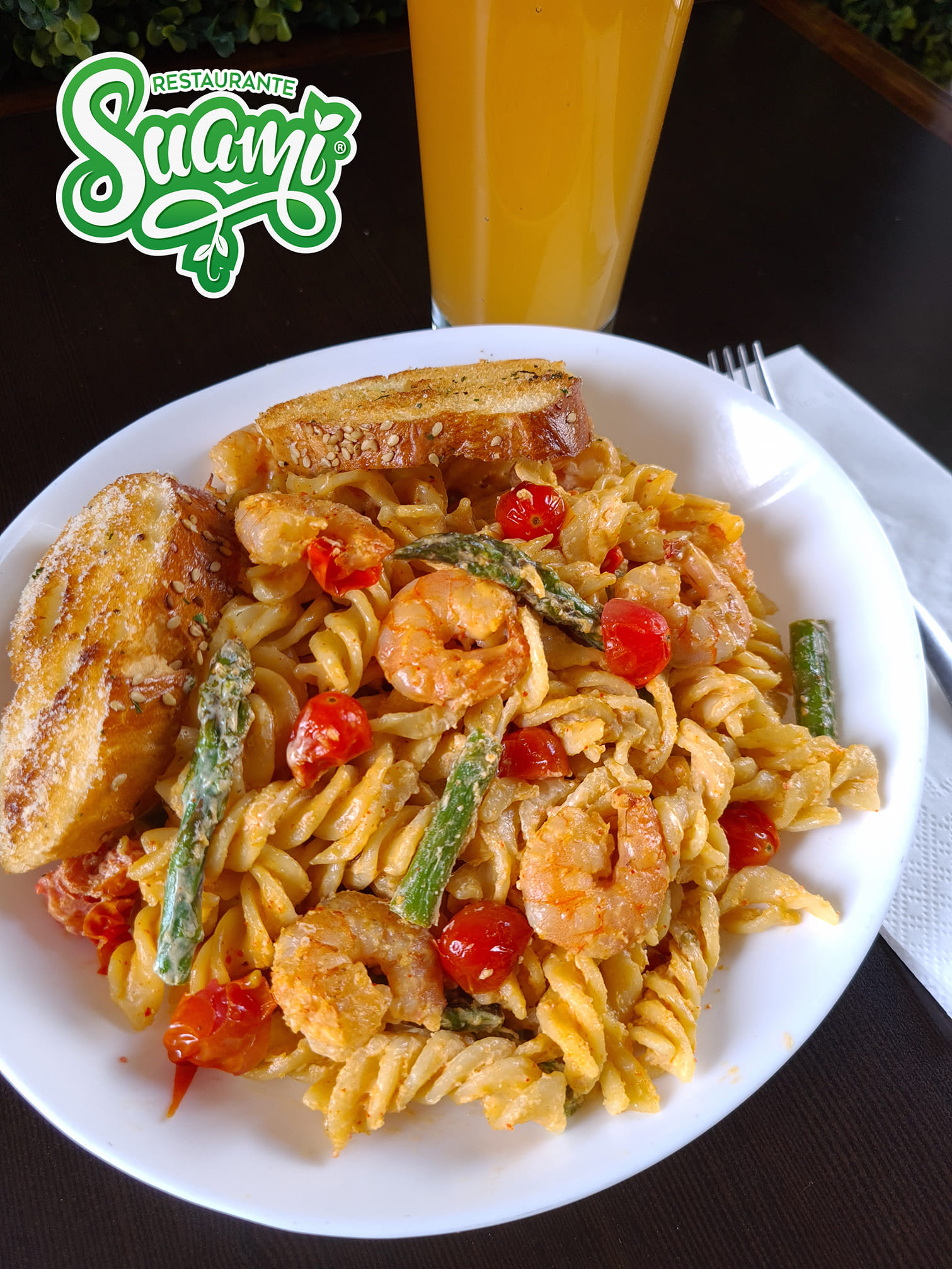 camarón, crema, espárrago y tomate cherry sazonada con queso parmesano, chile de árbol y vino blanco.