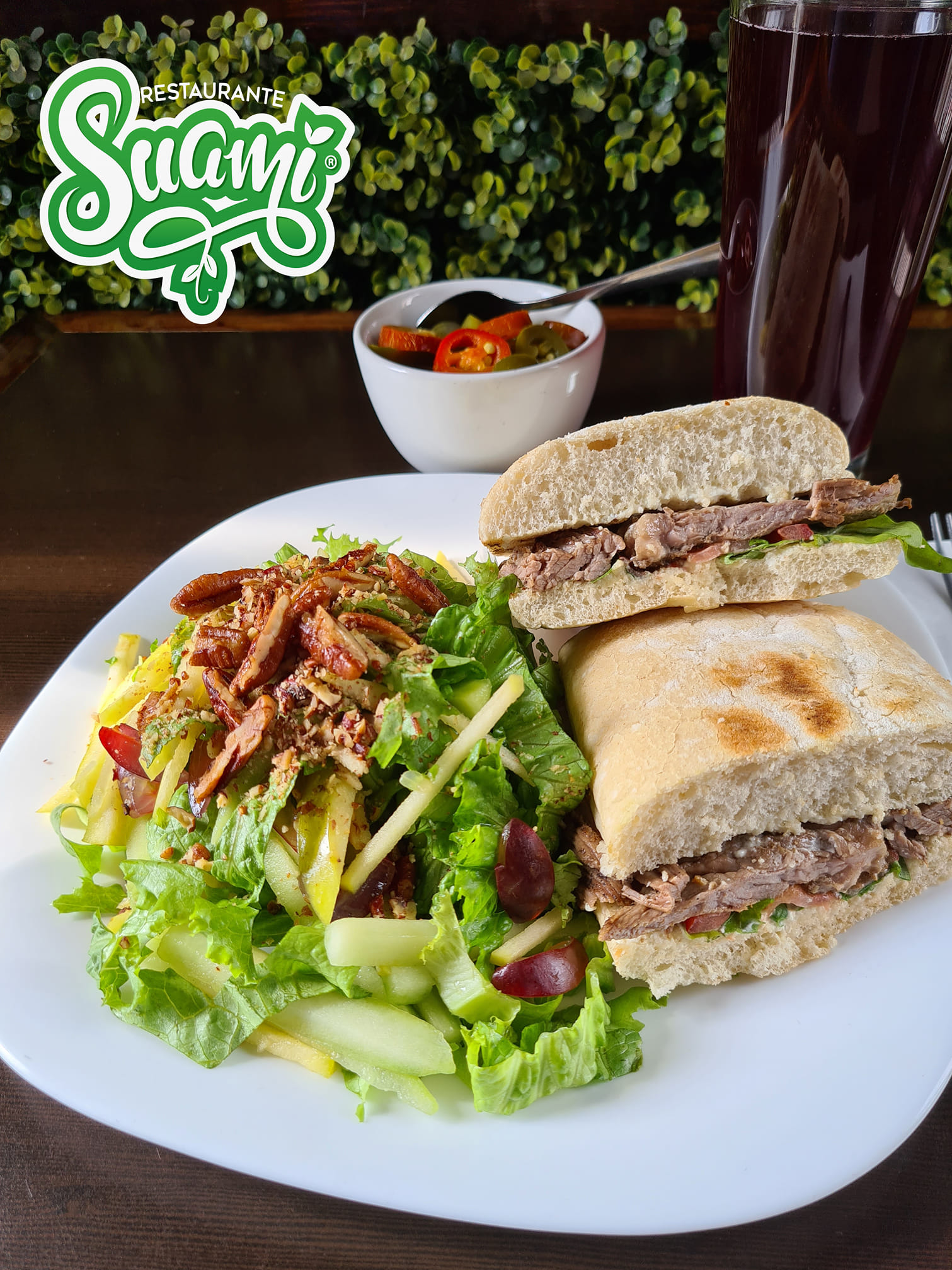 Lechuga, queso panela en cuadritos, aguacate, jitomate, cebolla morada, espárragos y queso parmesano espolvorado, con aderezo de chipotle. Acompañada de carne de res a la plancha.