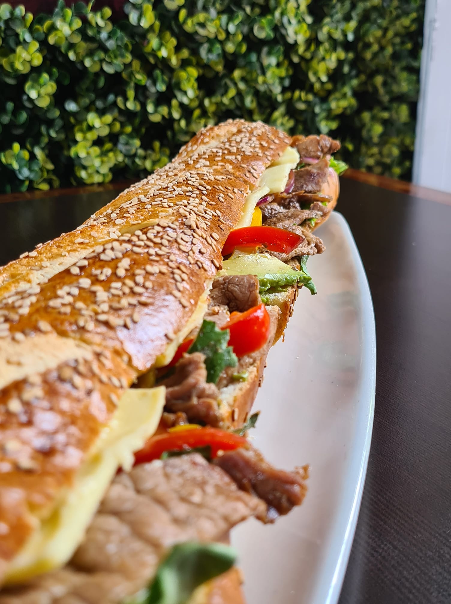 Baguette de 40 cms con bistec de res salteado con cebolla y pimiento morrón. Mayonesa, lechuga, queso manchego y aguacate.