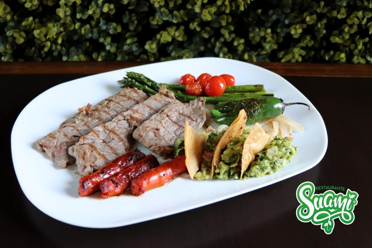 Chorizo argentino, cebolla morada, manchego, morrón, calabacita, frijoles, acompañado de guacamole y pico de gallo.