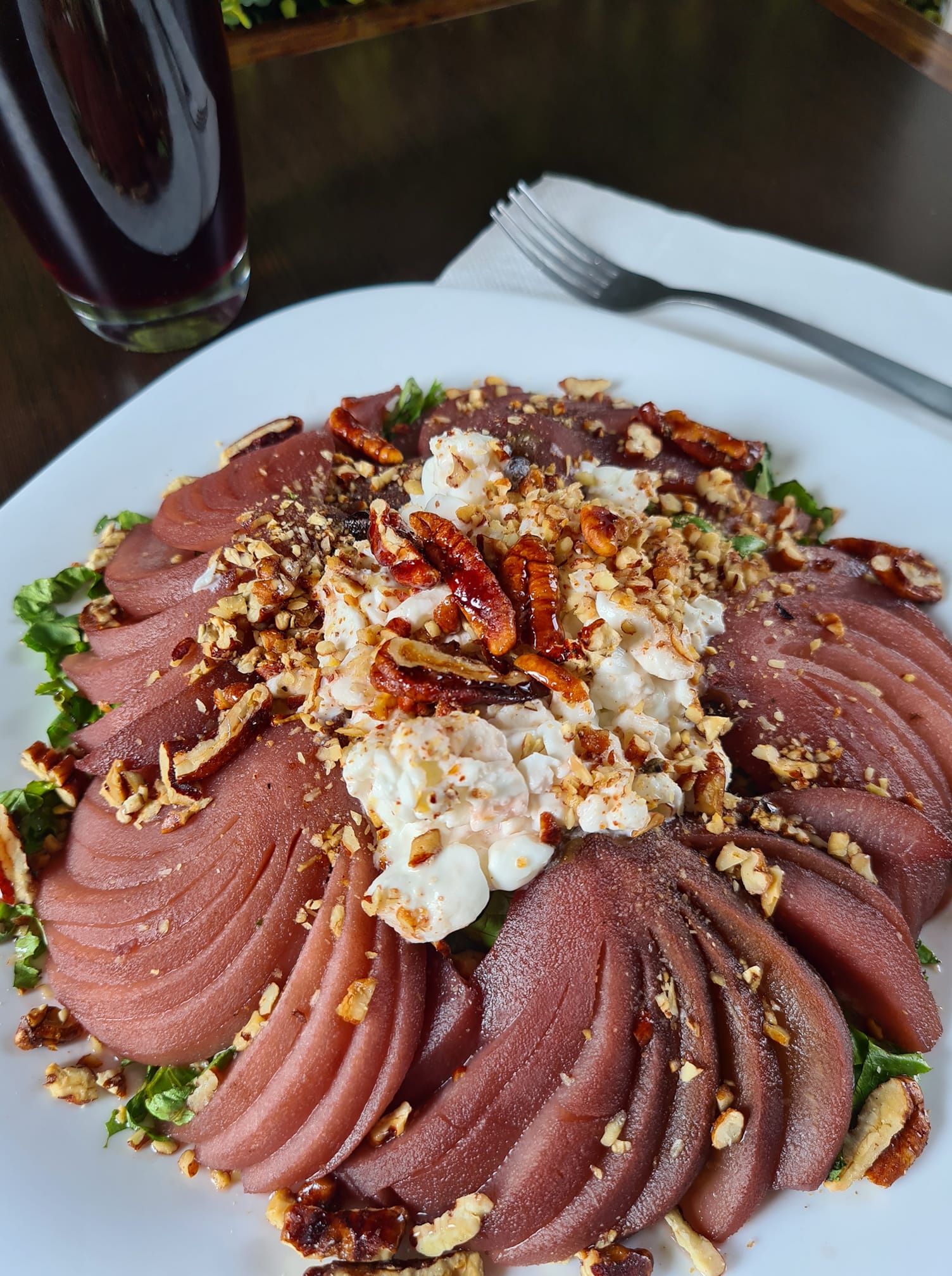 Lechuga con pera al vino tinto, queso cottage y nuez california con aderezo de vino tinto.