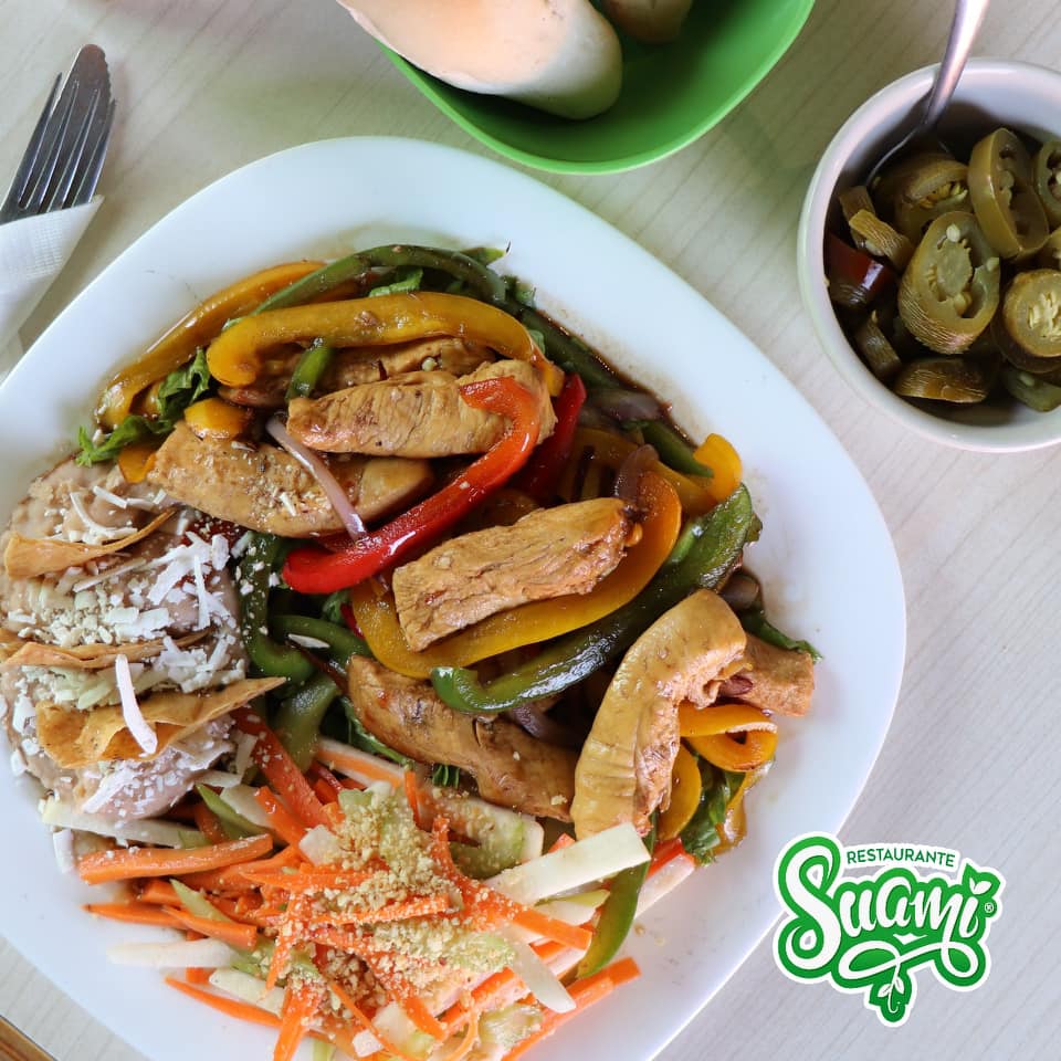 Pimiento morrón, cebolla, pollo o res ,sazonado con aderezo teriyaki, acompañados con ensalada boston y frijoles refritos con totopos.
