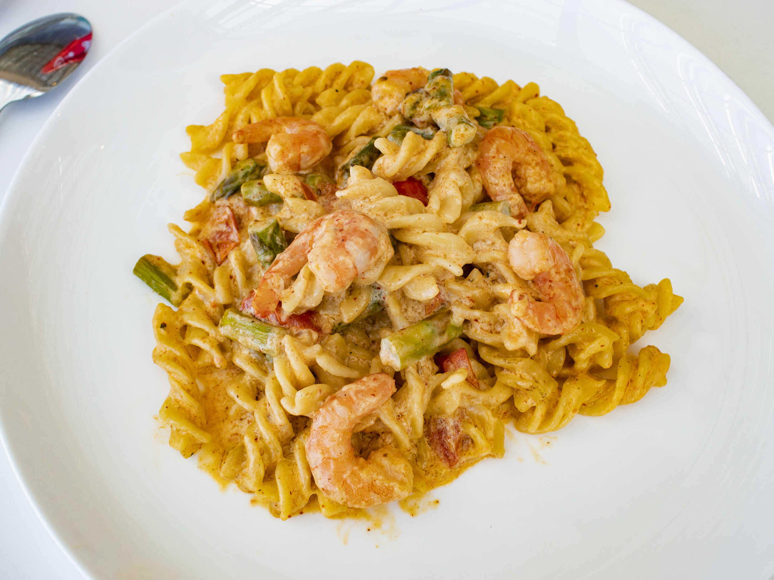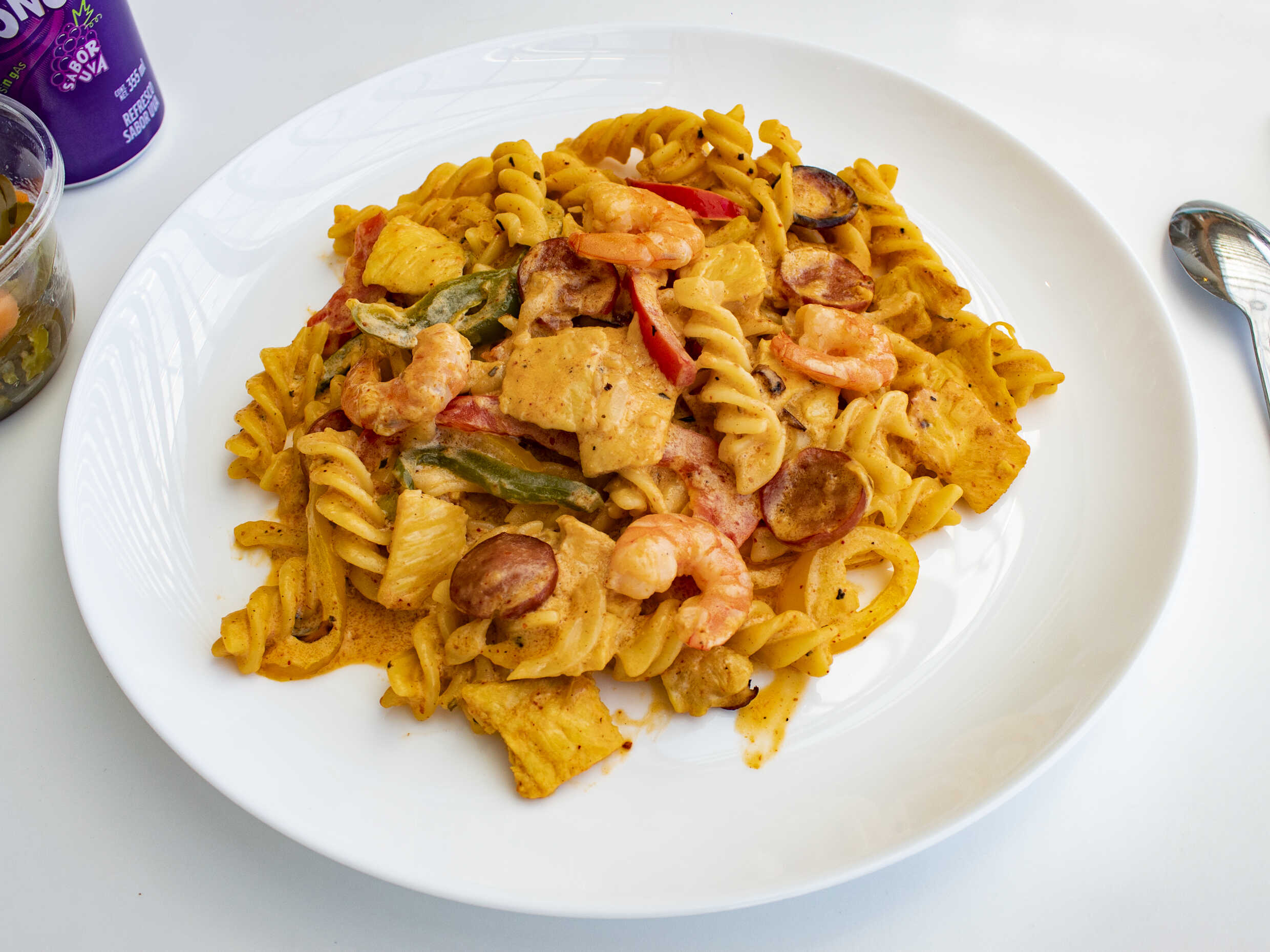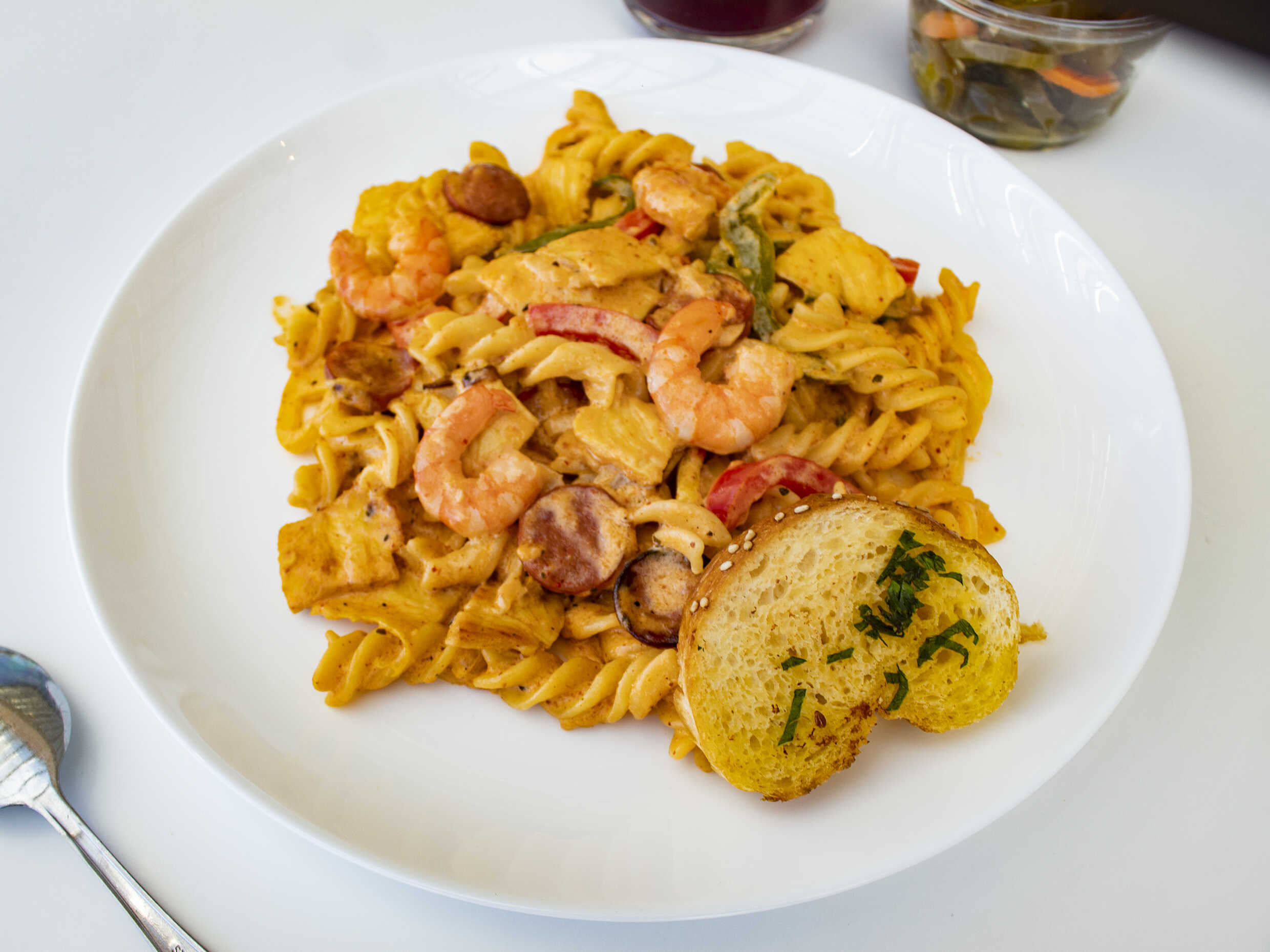 Pasta Fusilli con pollo, camarón, morrón y salchicha de res, sazonada con crema y condimento de la casa.