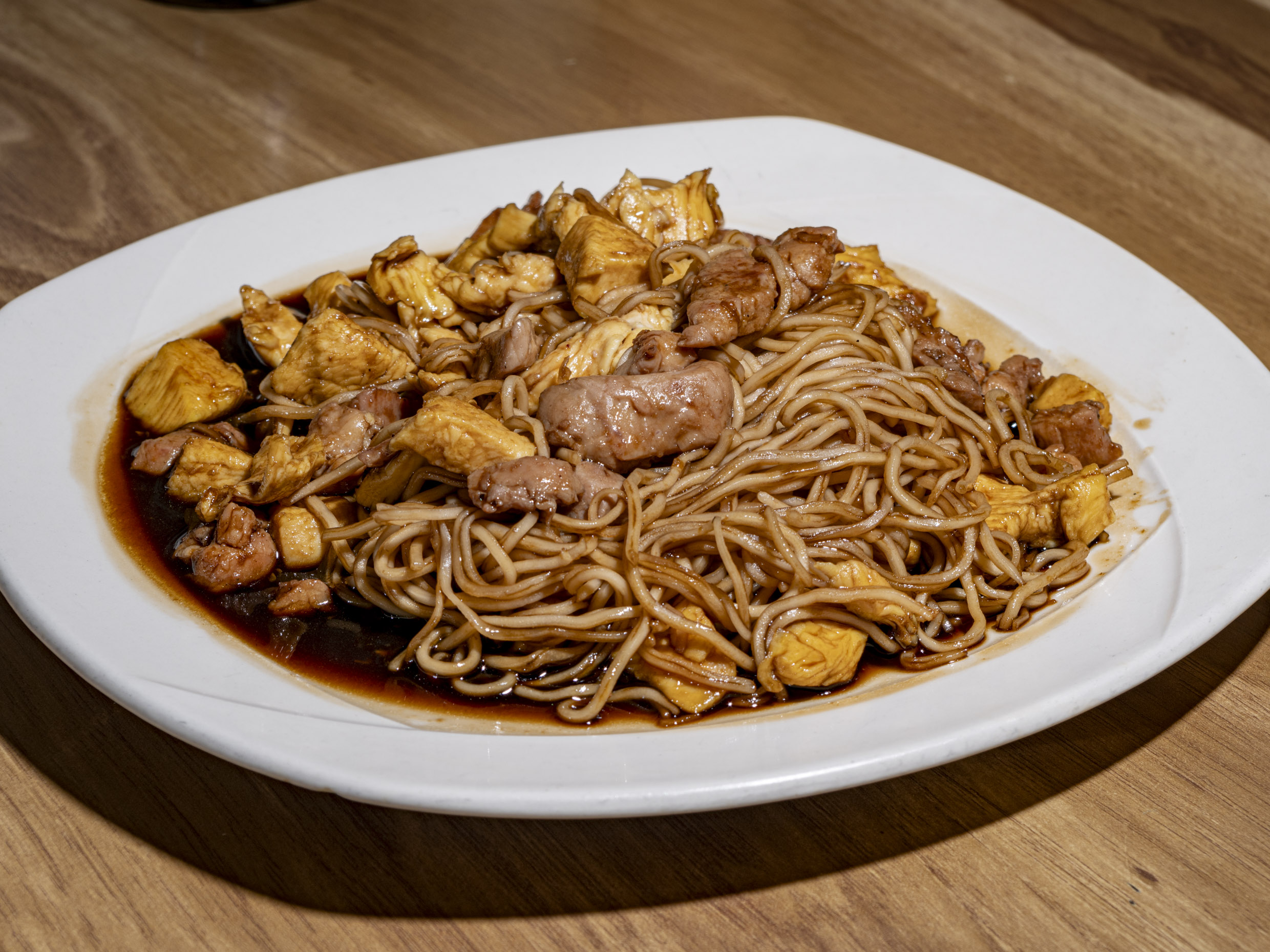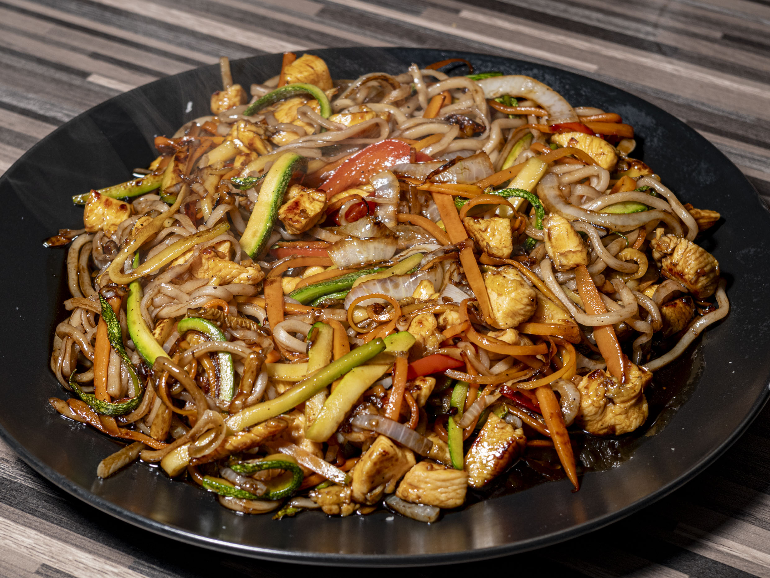 Platillo a base de pasta udon y verduras, preparado en salsa agridulce.