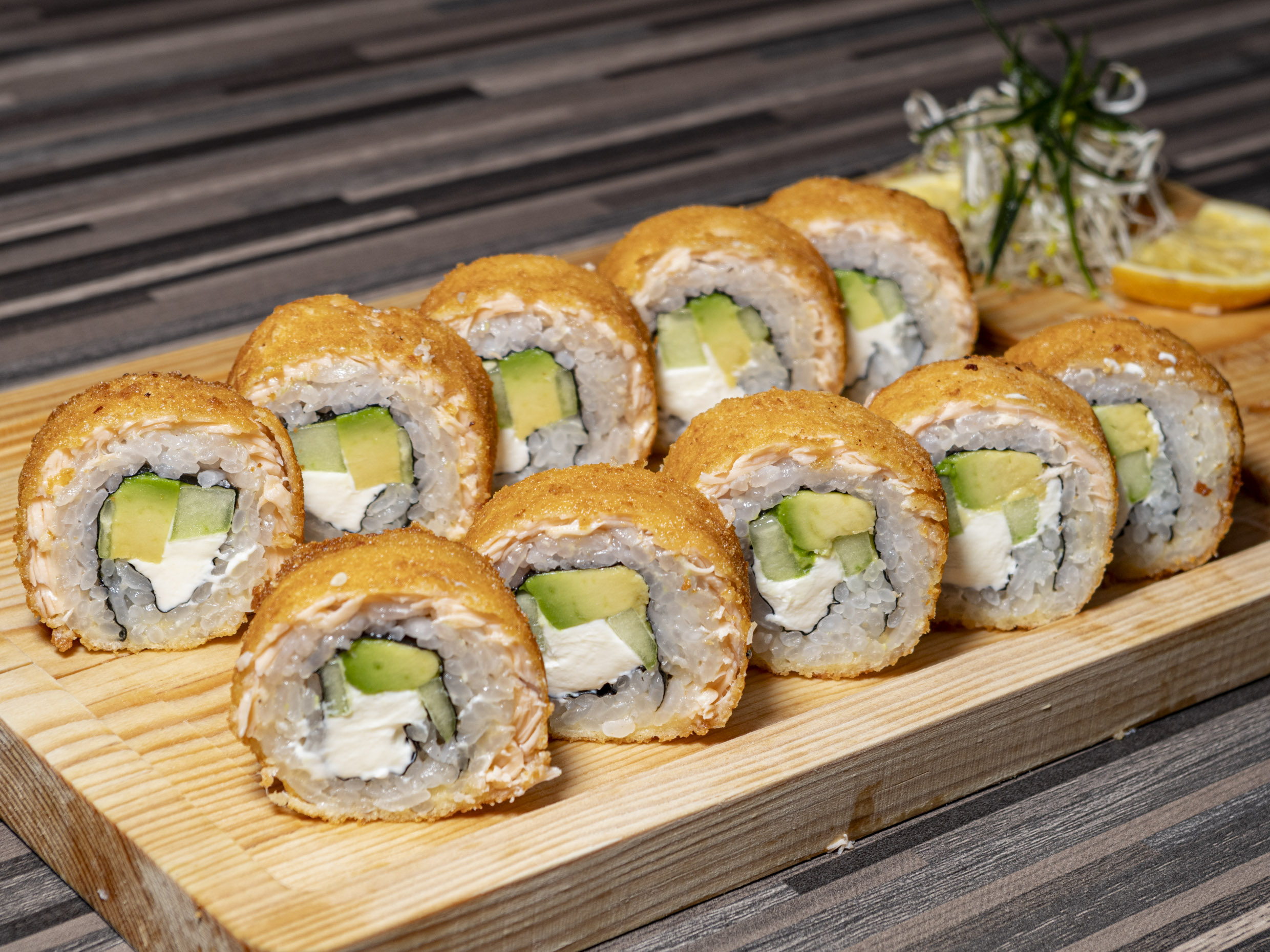 Relleno de queso philadelphia, pepino y kanikama empanizado, con topping de kani spicy y aguacate.