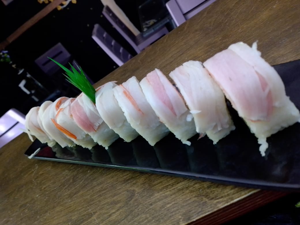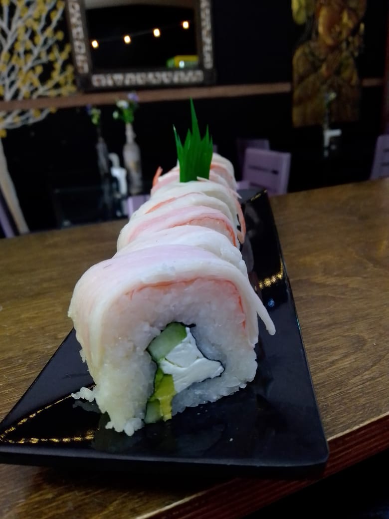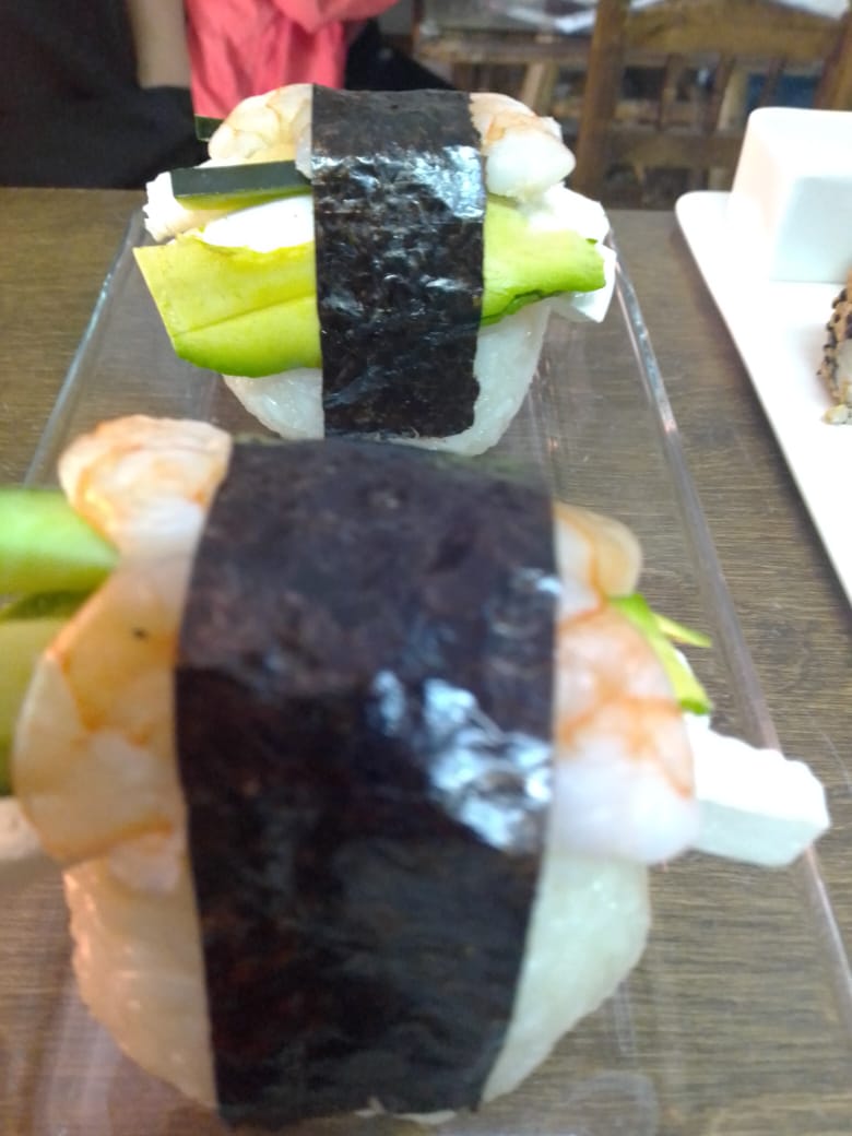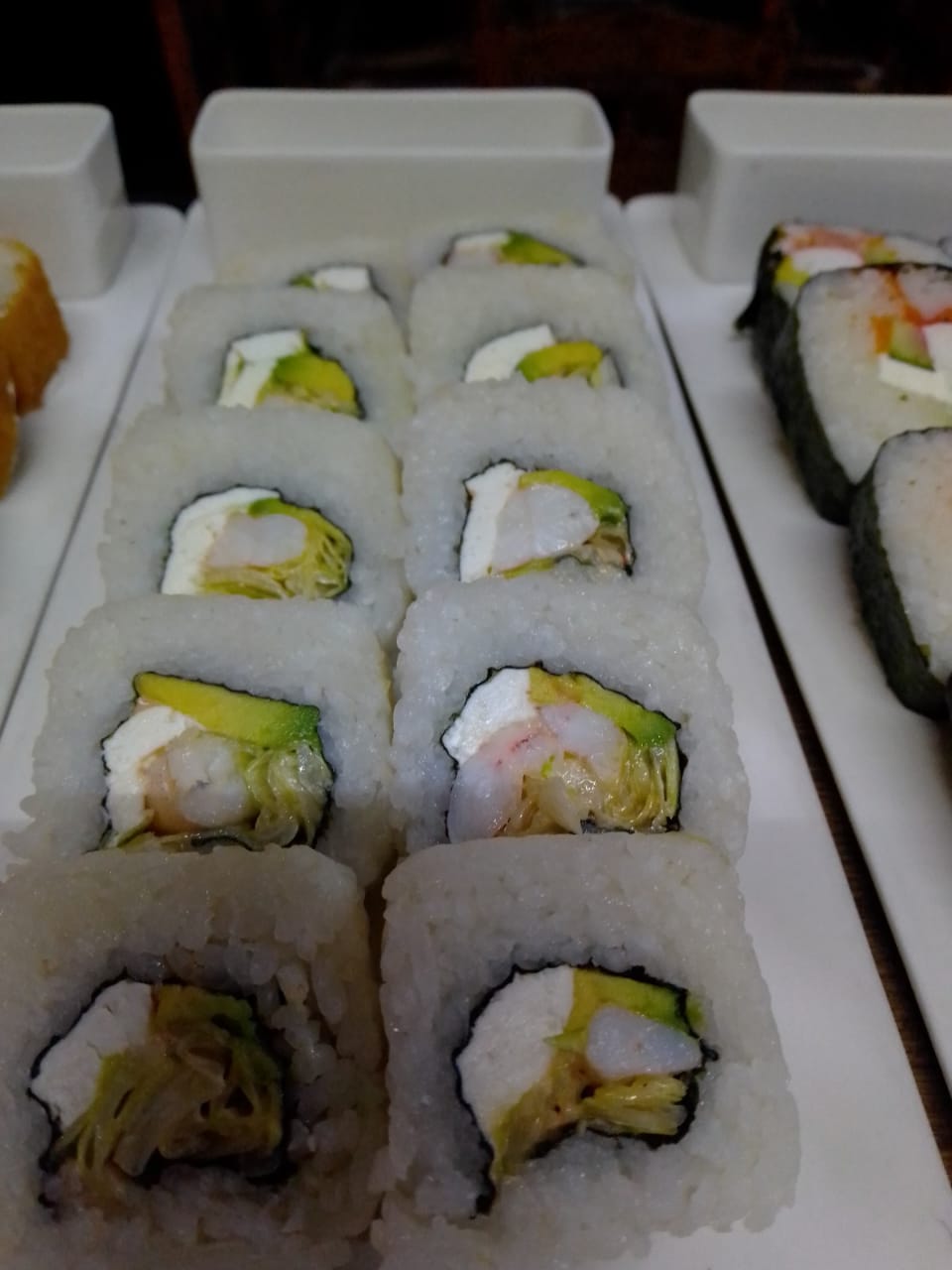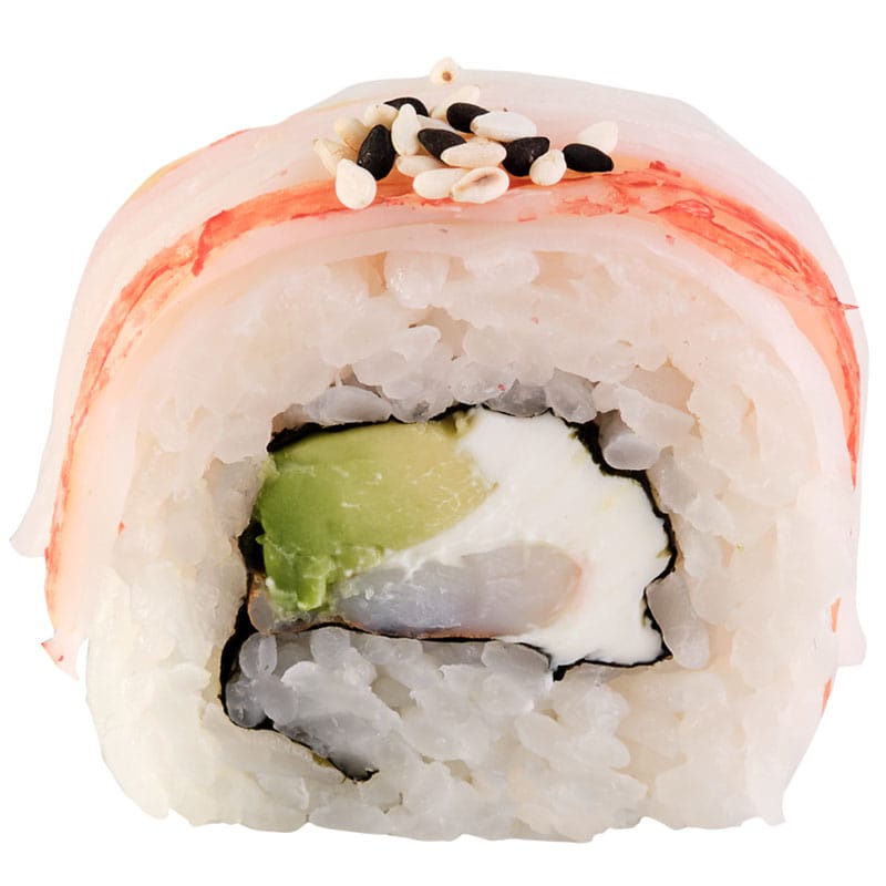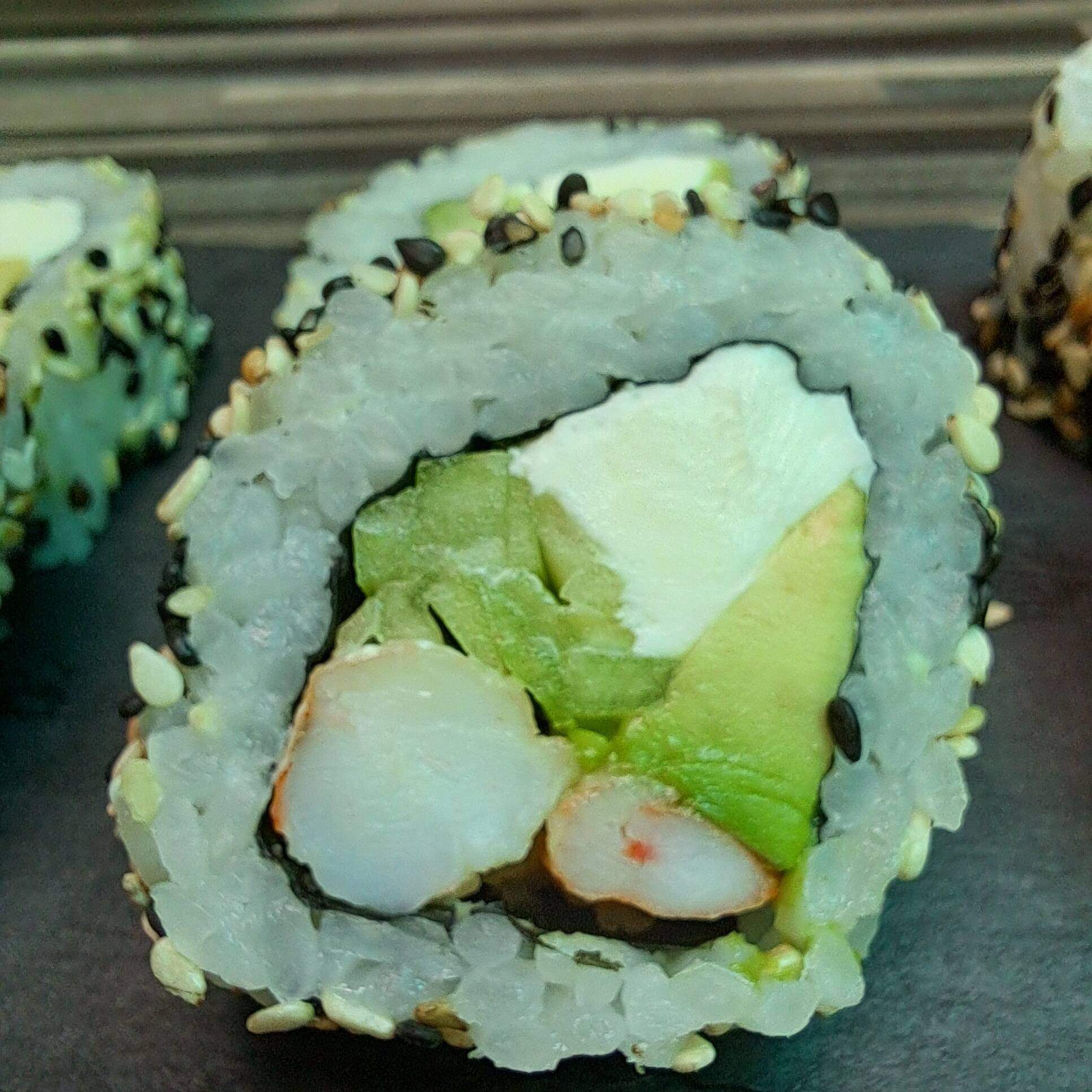 Kani y aguacate por fuera, queso, camarón y pepino por dentro.