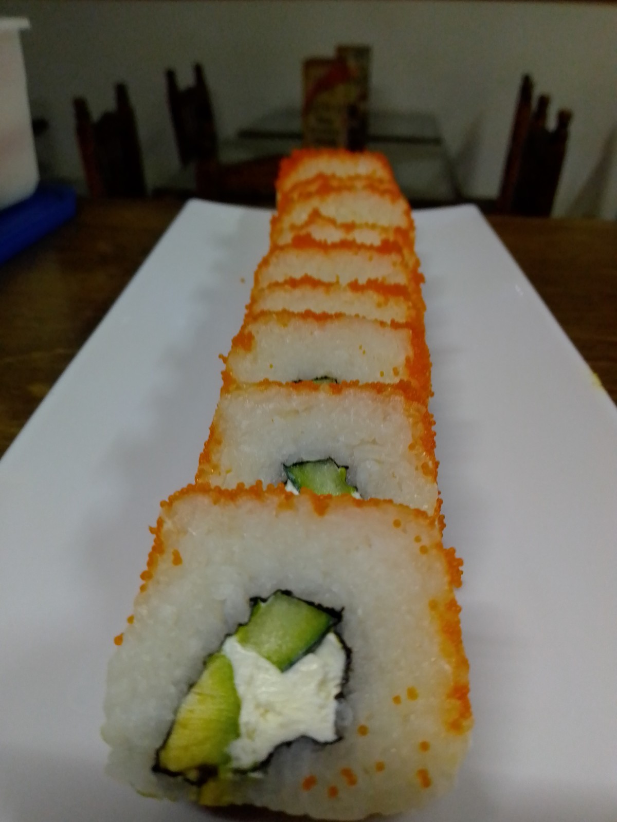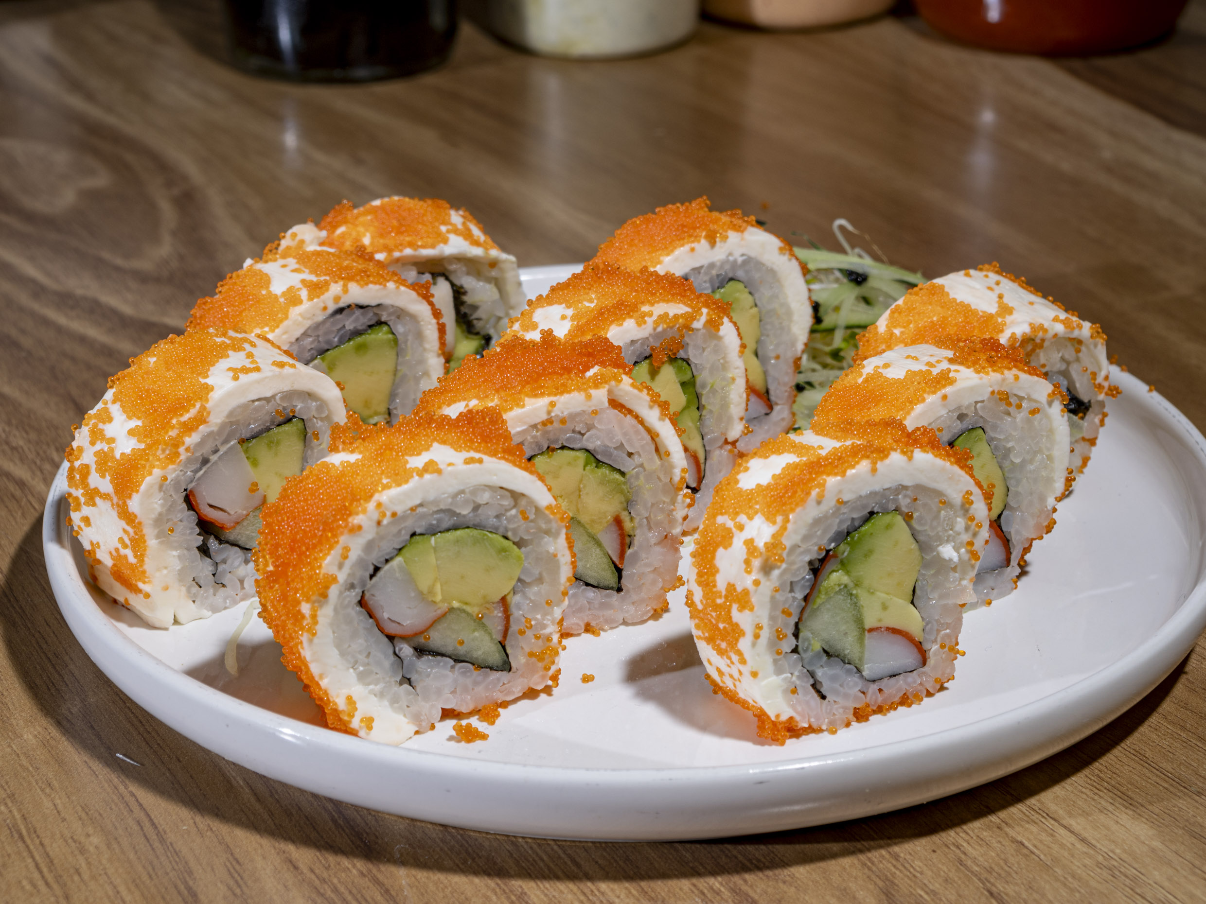 Masago por fuera, queso, pepino y aguacate por dentro.