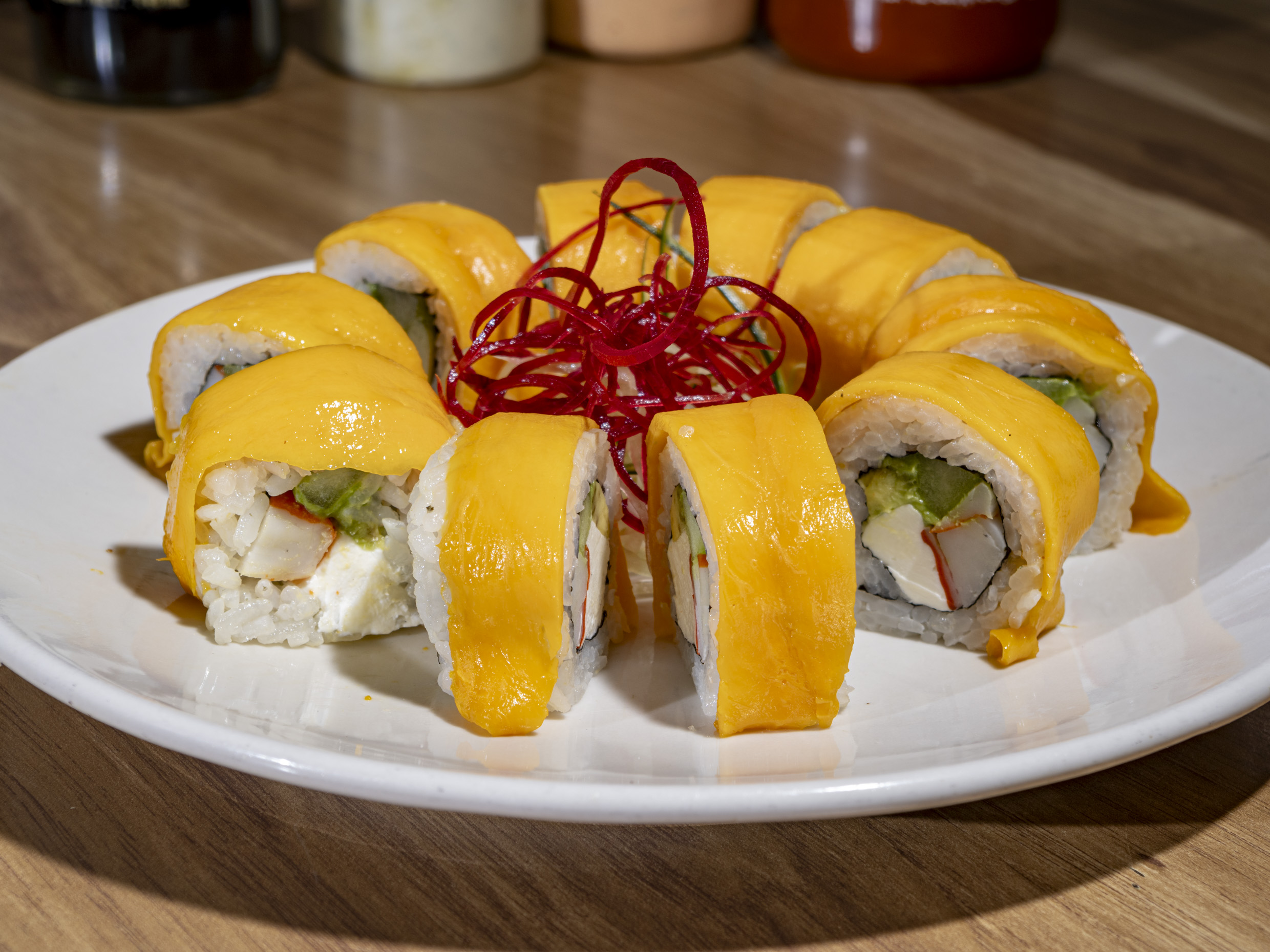 Mango por fuera, cangrejo, pepino, aguacate y Philadelphia por dentro.
