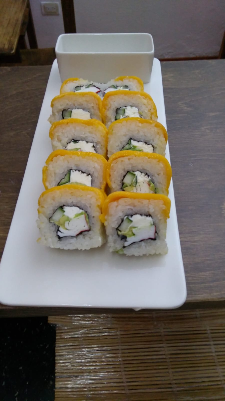 Queso y masago por fuera, pepino, aguacate y cangrejo por dentro.