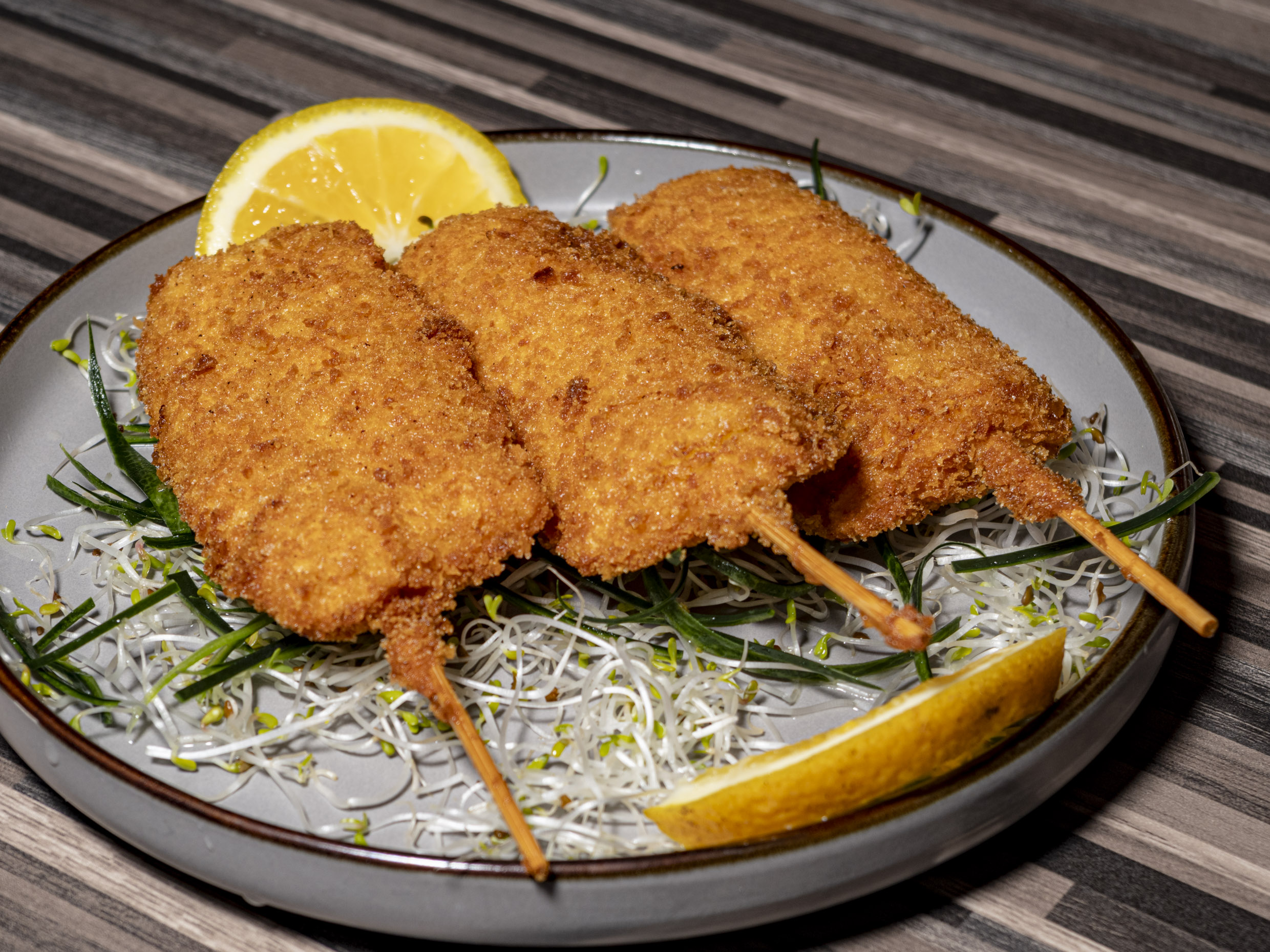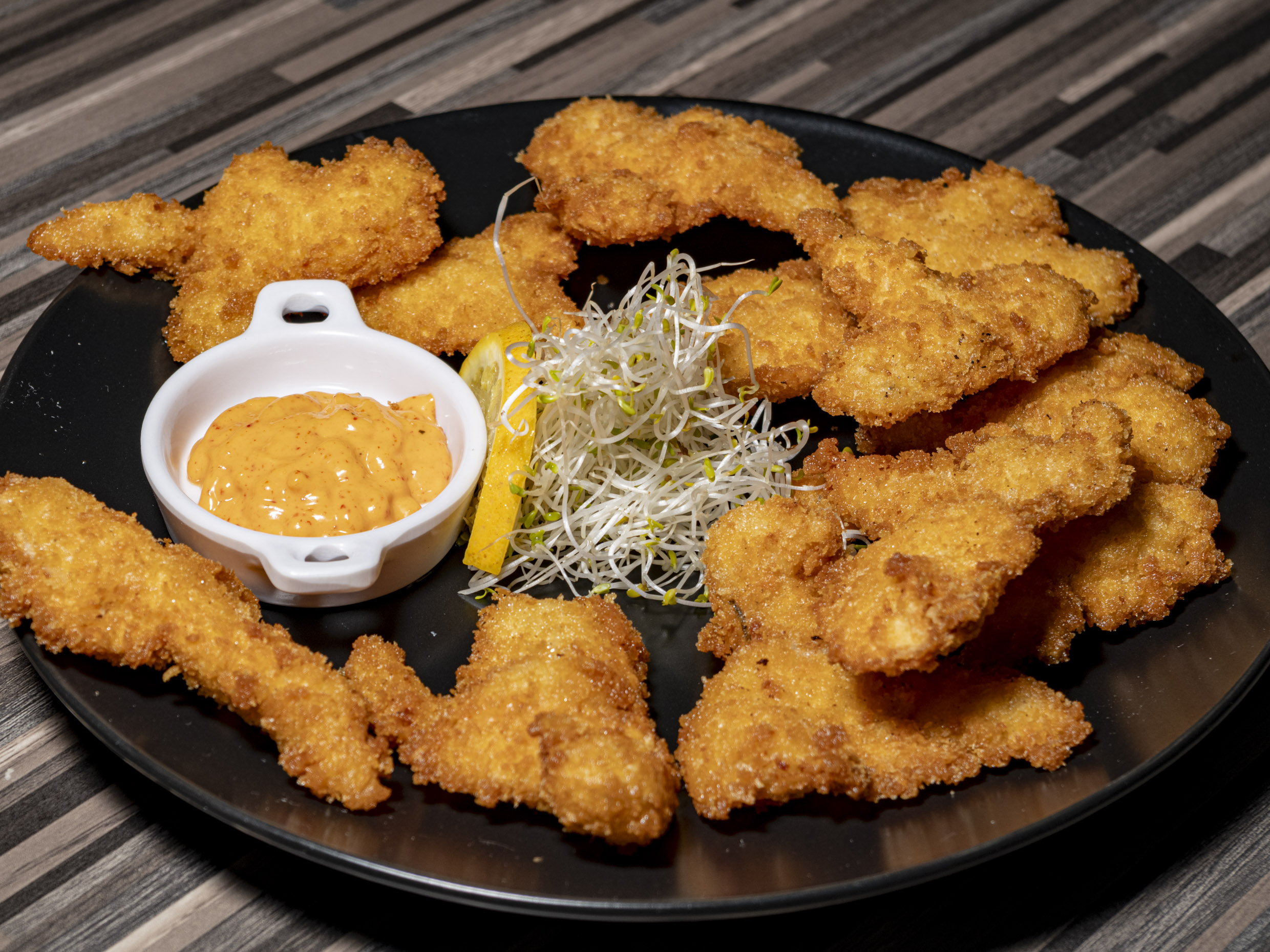 11 Camarones a la gabardina acompañados de aderezo de la casa.
